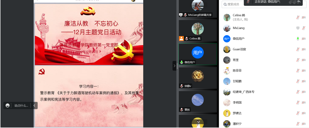 为推动“迎接二十大、做合格党员”系列活动走深走实,12月27月,体育与教育学院教师第一党支部线上召开“警示教育筑防线 廉洁自律守初心”主题党日活动,进一步增强全体党员遵纪守法和廉洁自律意识,筑牢拒腐防变思想防线。