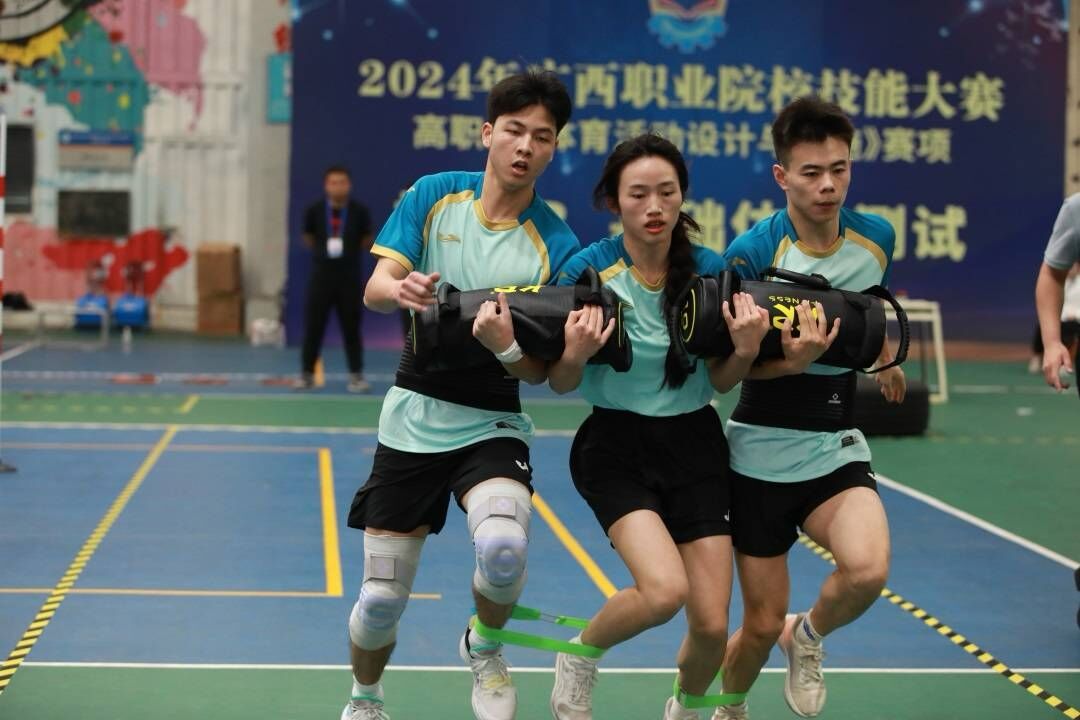 跳绳双摇、三人四足搬运能量包、翻运轮胎……3月16日,记者来到广西体育高等专科学校综合馆看到,这里激战正酣,选手们挥汗如雨地投入各项体能测试的比拼中,他们参加的是广西职业院校技能大赛高职组首次开设的体育活动设计与实施赛项。