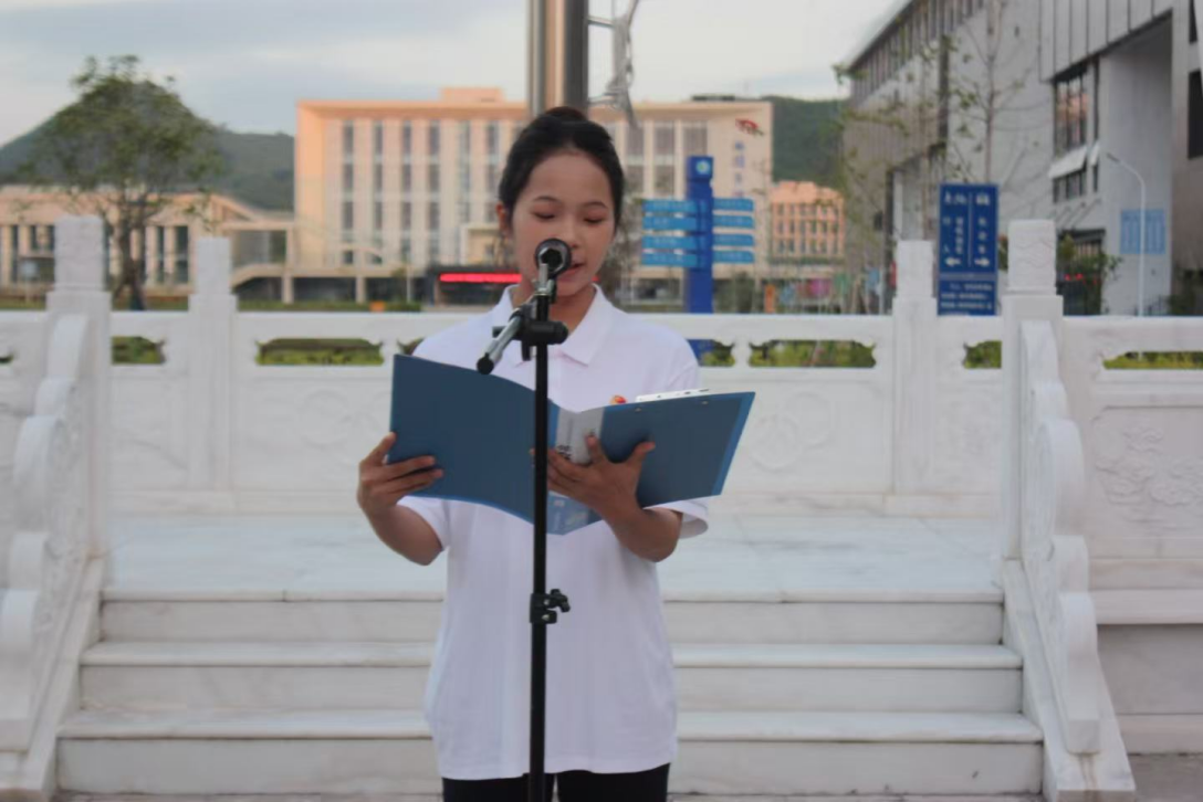 国旗飘扬,誓言无声。7时整,升旗仪式正式开始。国旗护卫队护送五星红旗入场,在庄严的国歌声中,全体师生行注目礼,国旗冉冉升起。