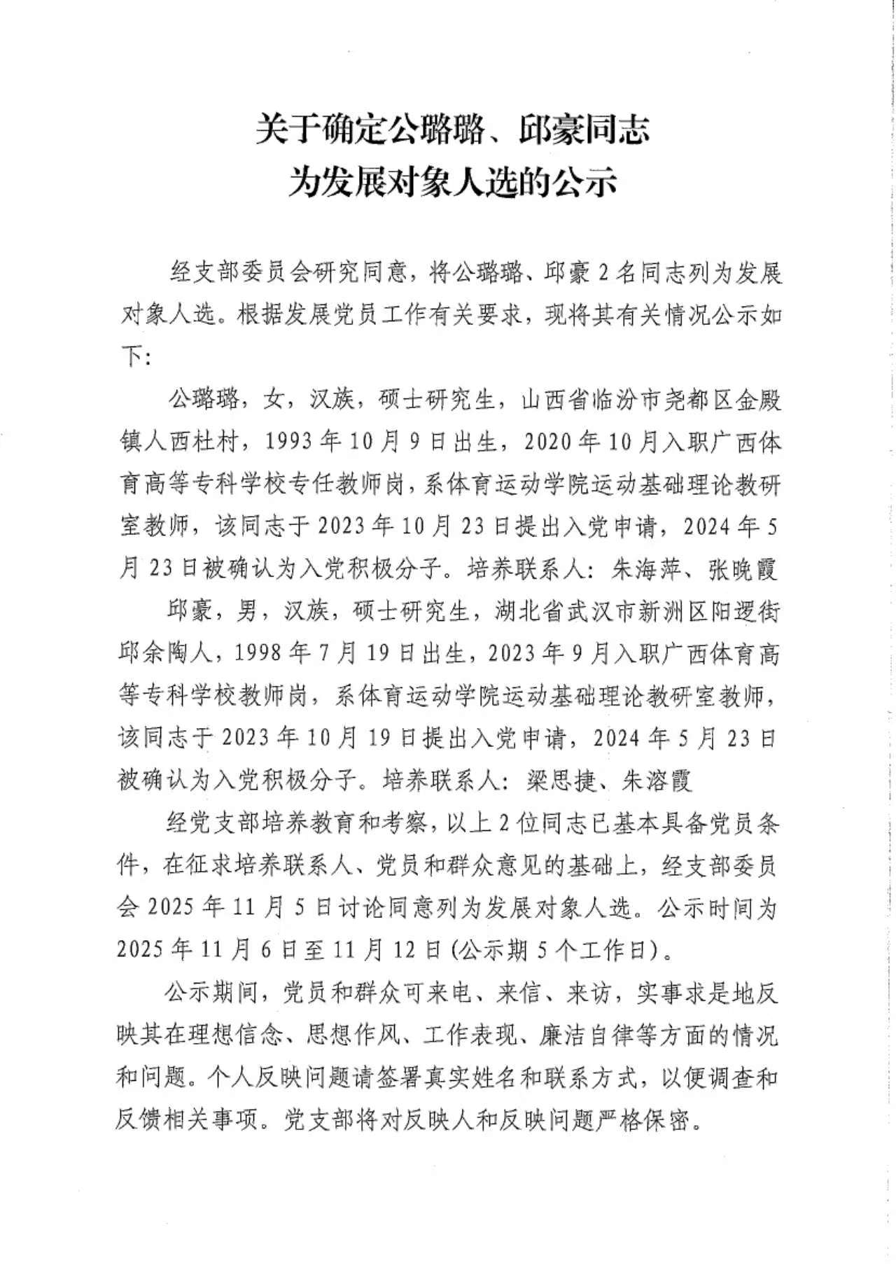 关于确定公璐璐、邱豪同志为发展对象人选的公示