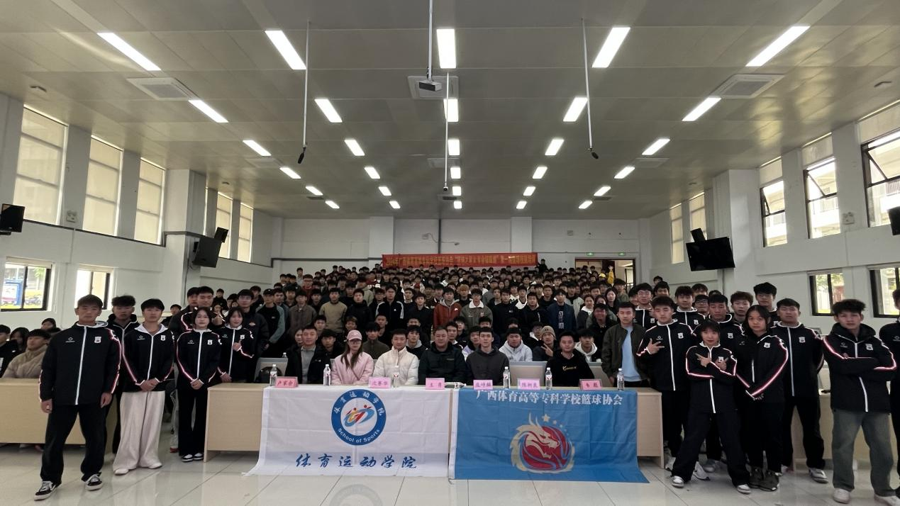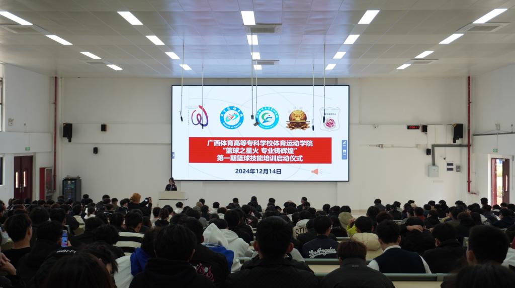 12月14日中午,2024年广西体育高等专科学校体育运动学院“篮球之星火 专业铸辉煌”第一期篮球技能培训开班仪式在北教学楼101阶梯教室举行。篮球技能培训扎根 “三全育人”,以篮球运动为载体,“以训助美”扎实推进实践育人,全方位滋养学员身心,助力全面发展,契合新时代育人需求。此次培训旨在培养一批高水平的篮球教练员、裁判员、解说员,推动我校篮球事业蓬勃发展。体育运动学院篮球教研室教师、广西篮球协会常务副主席王勇、广西篮球协会秘书长卢家余、体育运动学院团委书记沈赛华出席活动,400余名学员参加开班仪式。