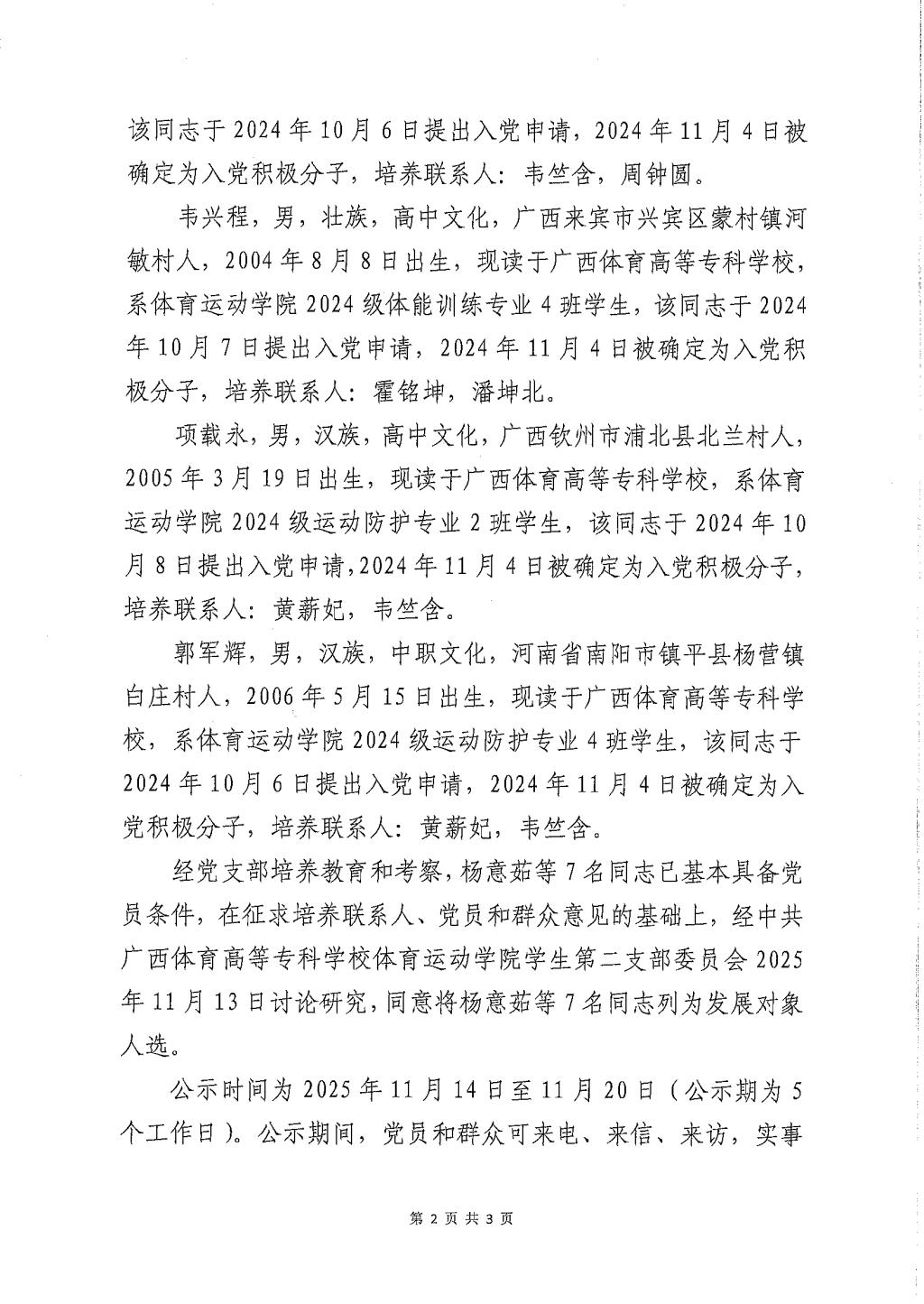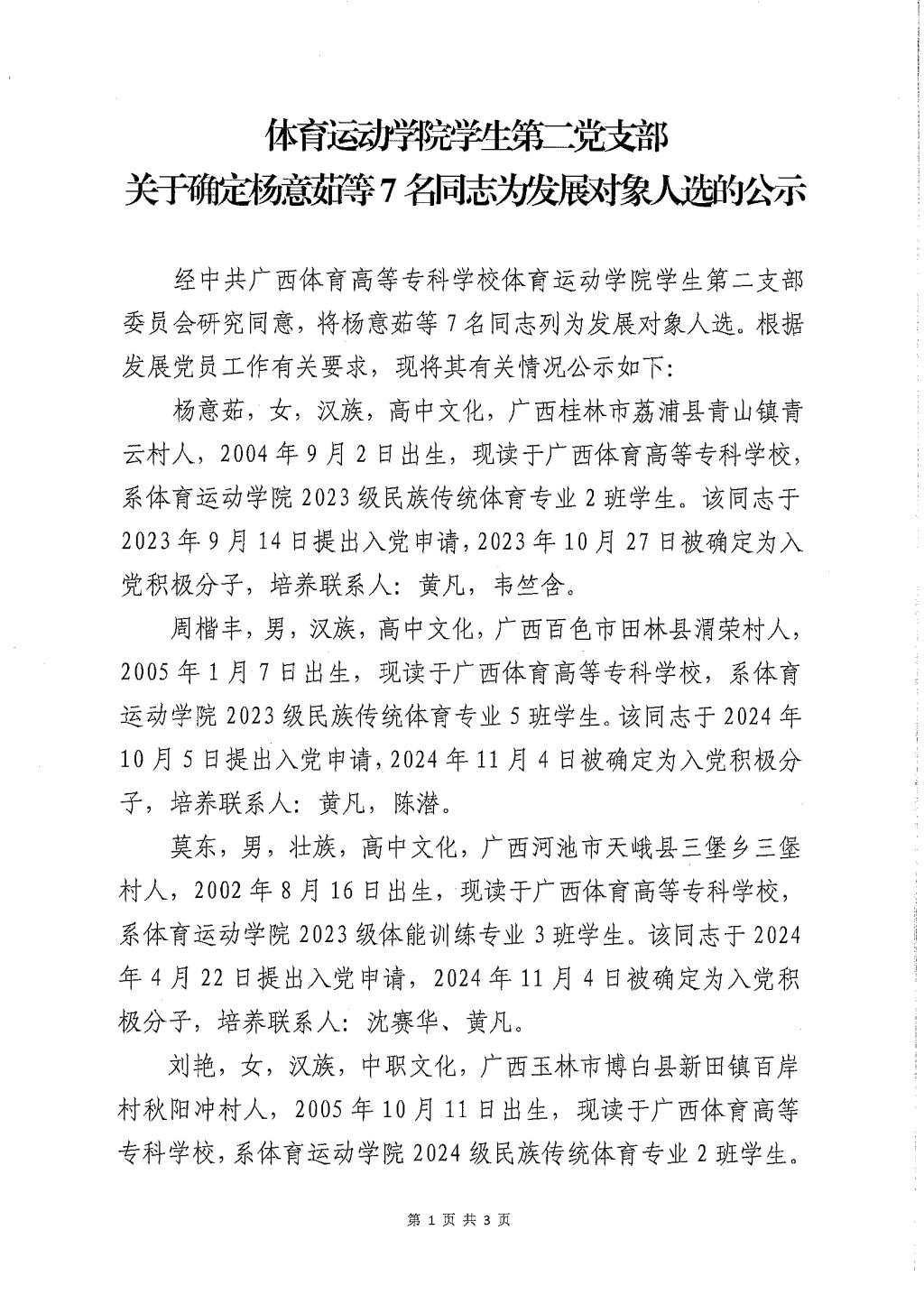 体育运动学院学生第二党支部关于确定杨意茹等7名同志为发展对象人选的公示
