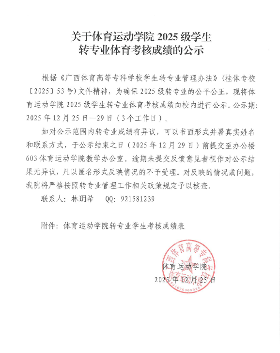 关于体育运动学院2025级学生转专业体育考核成绩的公示