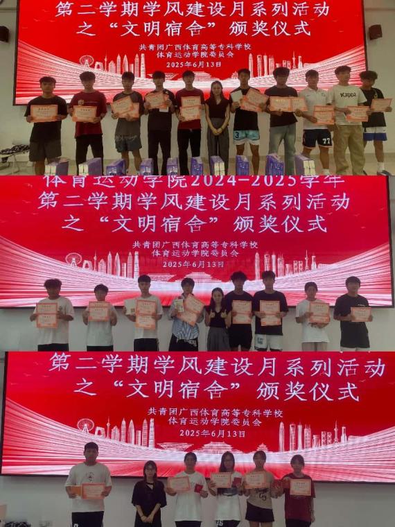 大学宿舍是学生生活的重要场所,也是培育文明素养的关键阵地。为营造安全、整洁、和谐、有序的宿舍环境,体育运动学院于5月-6月组织开展文明宿舍评比活动,并于6月17日举行了颁奖仪式。