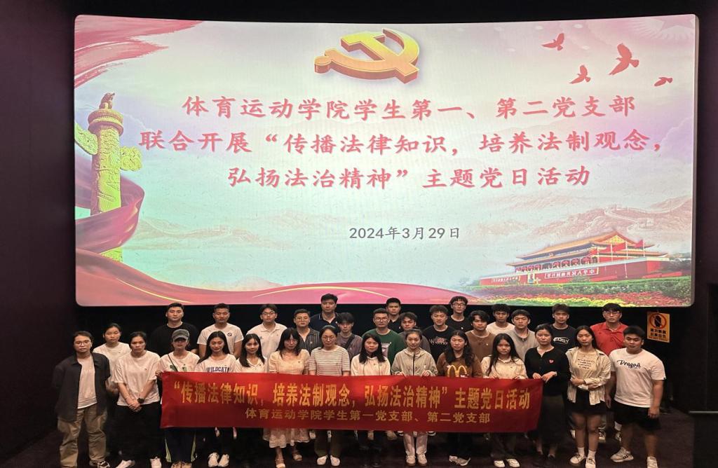 为深入学习贯彻习近平新时代中国特色社会主义思想和党的二十大精神,弘扬社会主义法治精神,3月29日,体育运动学院学生第一、第二党支部联合开展“传播法律知识,培养法制观念,弘扬法治精神”主题党日活动,组织支部全体师生党员,前往幸福蓝海国际影城集中观看法律题材电影《第二十条》。
