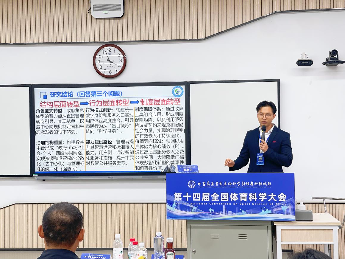 体育管理学院郑子杰老师在体育管理分会汇报了《数智赋能全民健身公共服务中的政府角色转型研究——基于“放管服”改革的政策工具组合分析》。该研究紧扣时代脉搏,探讨了数字智能技术在推动政府职能转变、优化全民健身公共服务供给中的作用,视角新颖,分析深刻。
