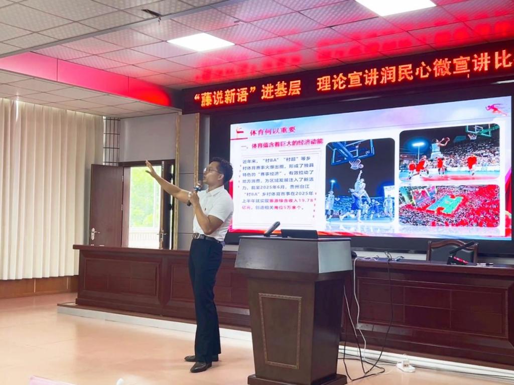 刘智炜则以《体育之桥,联通乡村振兴之路》为宣讲核心,以薪火相传的“龙舟精神”为切入点,分享了杨垌村通过暑期托管班与“星光球场”凝聚民心的生动实践,将体育比作联通乡村治理的桥梁,精彩诠释了“体育+”赋能乡村振兴的创新路径与实践成效。
