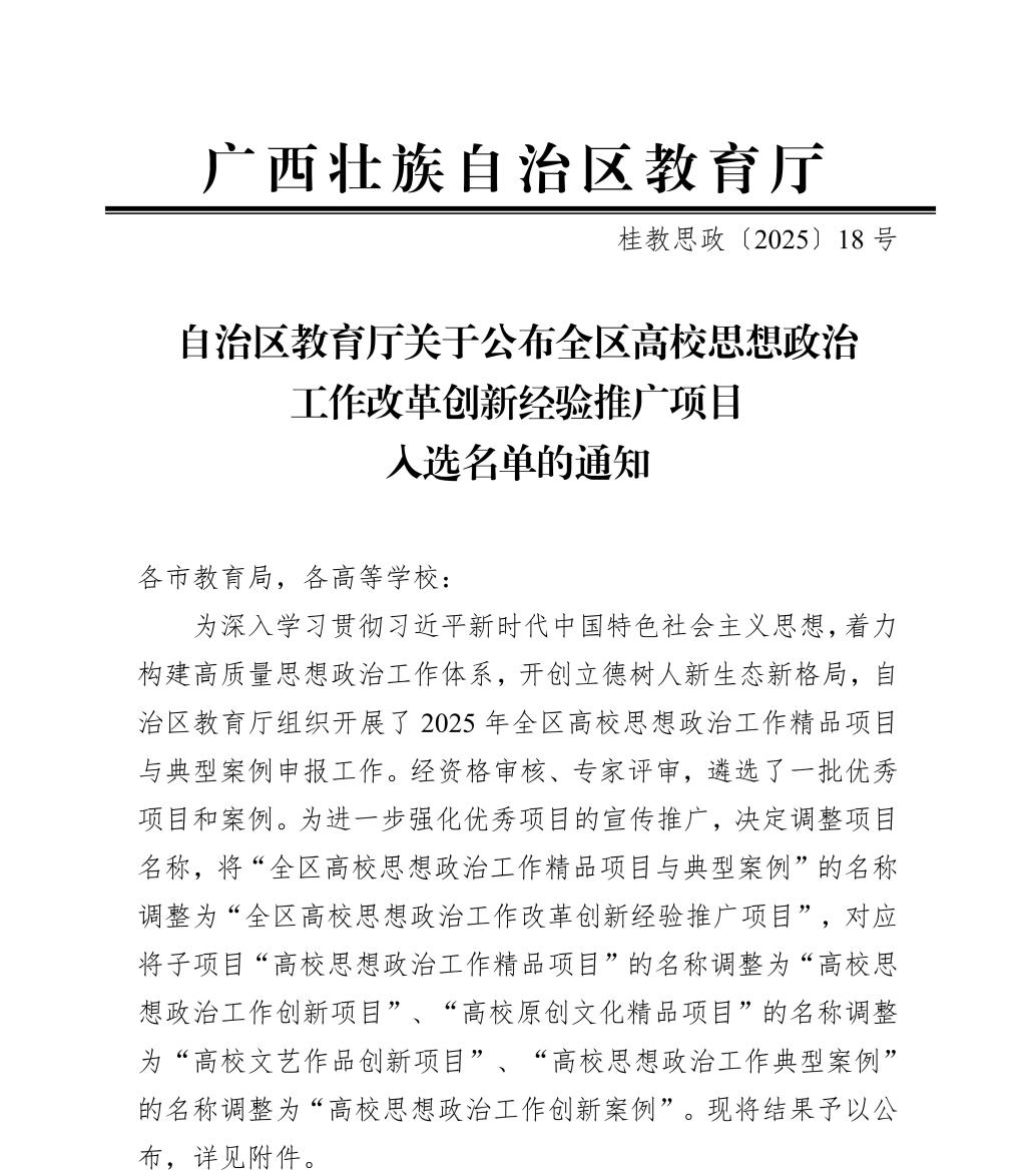 近日,自治区教育厅公布全区高校思想政治工作改革创新经验推广项目入选名单,我校3个项目成功入选。其中,张忠主持申报的《武魂耀中华:瓦氏俍兵破敌卫家园》入选高校文艺作品创新项目;宁陶主持申报的《“以体育人”引领“五维融合”驱动:新时代体育强国建设成就融入高校“大思政课”的实践探索》入选新时代伟大变革融入高校思想政治教育创新案例;刘莉主持申报的《赛场心育三部曲:疏导・赋能・超越》入选高校学生心理健康教育指导创新案例。