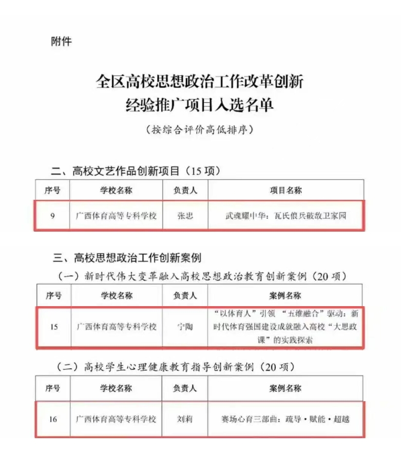这些项目的成功入选,是我校锚定“体育+思政”育人方向、以壮体文化铸魂育人的生动实践——从俍兵破敌卫家园的壮乡武术精神传承,到“以体育人”融入大思政课的实践探索,再到“赛场心育”赋能体育学子成长,每一个项目都充分体现了我校思政育人成效。