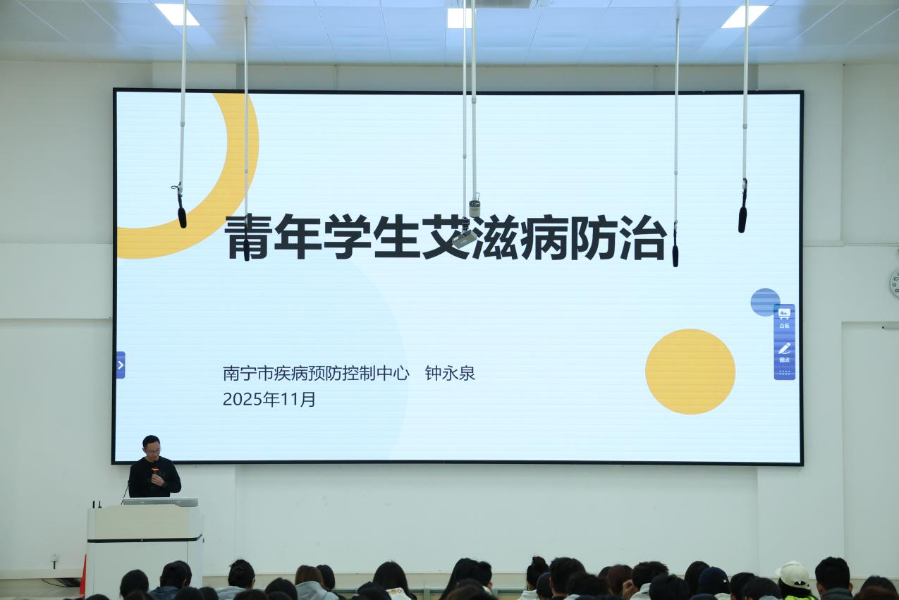 本次讲座特邀南宁市疾病预防控制中心专家钟永泉担任主讲嘉宾,他结合最新防艾数据和典型案例,用通俗易懂的语言详细讲解了艾滋病的传播途径、临床表现、预防措施等核心知识,重点澄清了大众对艾滋病的常见认知误区;针对青年学生群体的特点,他鼓励学生树立正确的婚恋观和健康观,既要尊重艾滋病患者,也要学会自我保护,远离感染风险。讲座现场互动频繁,学生们就关心的问题积极提问,专家逐一耐心解答,有效提升了知识普及的针对性和实效性。