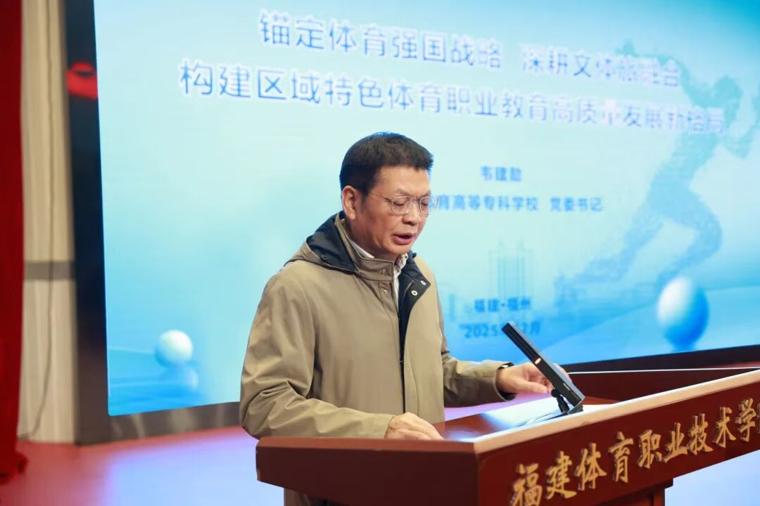 12月5日,由国家体育总局科教司主办的2025年全国体育职业教育研讨会在福州召开,旨在锚定体育强国、教育强国建设目标,共谋“十五五”时期体育职业教育高质量发展蓝图。国家体育总局科教司教育处处长、二级巡视员范英华,教育部职业教育与成人教育司职业院校发展处处长朱金明出席会议并讲话。学校党委书记韦建勋在会上作典型发言,系统分享了学校深耕文体旅融合、构建区域特色体育职业教育体系的实践成果与未来规划。