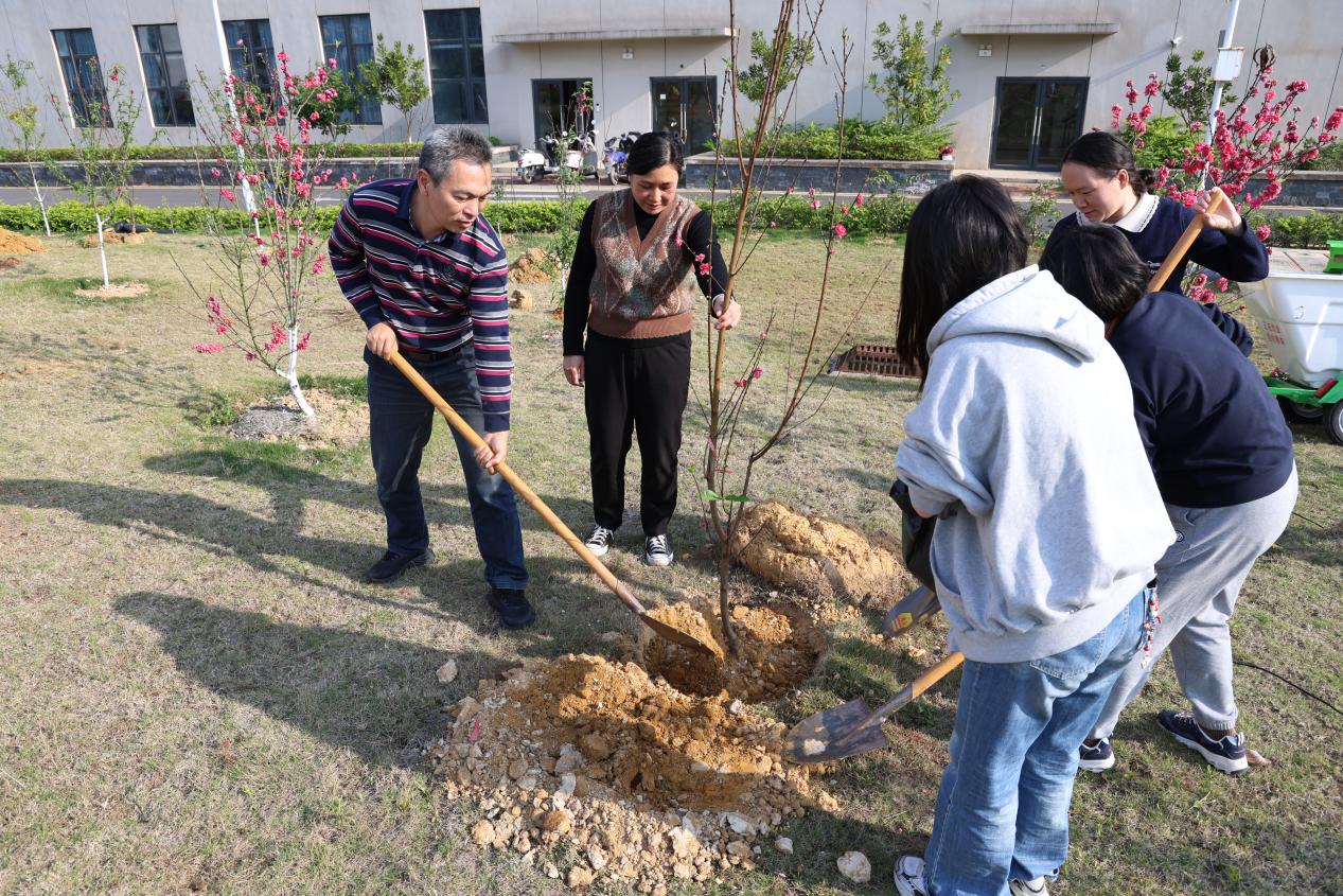 植树现场,大家热情饱满、分工协作、秩序井然。挥锹铲土、扶苗扶正、填土压实、浇水涵养,各个环节衔接有序。师生们共同栽植桃树,以实际行动为校园播撒新绿,让育人愿景与苗木一同茁壮成长。