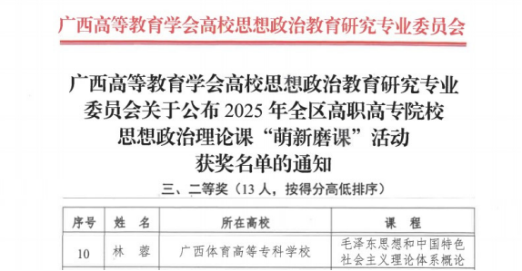 近日,广西高等教育学会高校思想政治教育研究专业委员会公布了2025年全区高职高专院校思想政治理论课“萌新磨课”活动获奖名单,我校马克思主义学院林蓉老师荣获《毛泽东思想和中国特色社会主义理论体系概论》课程组别二等奖。