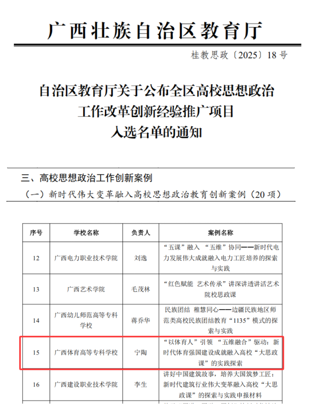 近日,自治区教育厅公布2025年全区高校思想政治工作改革创新经验推广项目入选名单。由我院宁陶老师主持,谢有长、黄航、胡萍、庞清四位老师参与完成的案例《“以体育人”引领“五维融合”驱动:新时代体育强国建设成就融入高校“大思政课”的实践探索》,成功入选广西高校思想政治工作创新案例。