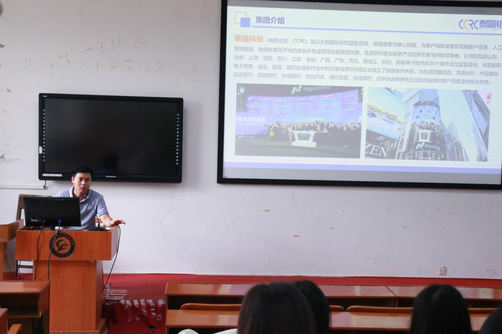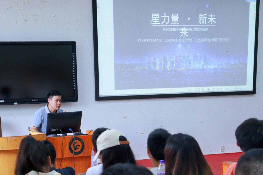 本次宣讲会邀请到了高尔夫联盟、龙湖集团、泰银科技集团、五洲管理&千城建筑四个企业进行宣讲。会上,企业代表曾永清对各企业的规模、文化、薪资待遇、发展前景等方面进行详细宣讲,并就当前的就业形式以及职业选择的重要性进行了详细分析和耐心讲解。