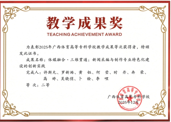 近日,广西体育高等专科学校公布2025年校级教学成果奖获奖名单,由我院新闻采编与制作专业教师团队完成的教学成果《体媒融合·三维贯通:新闻采编与制作专业特色化建设的创新实践》荣获二等奖。