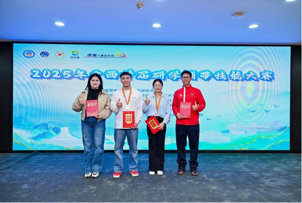 12月3日,由广西旅游协会指导、广西国际商务职业技术学院主办的“2025年广西首届研学辅带技能大赛决赛”在南宁饭店举行。我院研学旅行管理与服务专业学生吴才俊、刘小连凭借扎实的专业功底和稳定的现场发挥,从53名参赛选手中脱颖而出,分获大赛第二、三名,双双摘得银奖。同时,李俊健、卢韵颖两位老师获评“优秀指导老师”,学校荣获“最佳组织奖”。