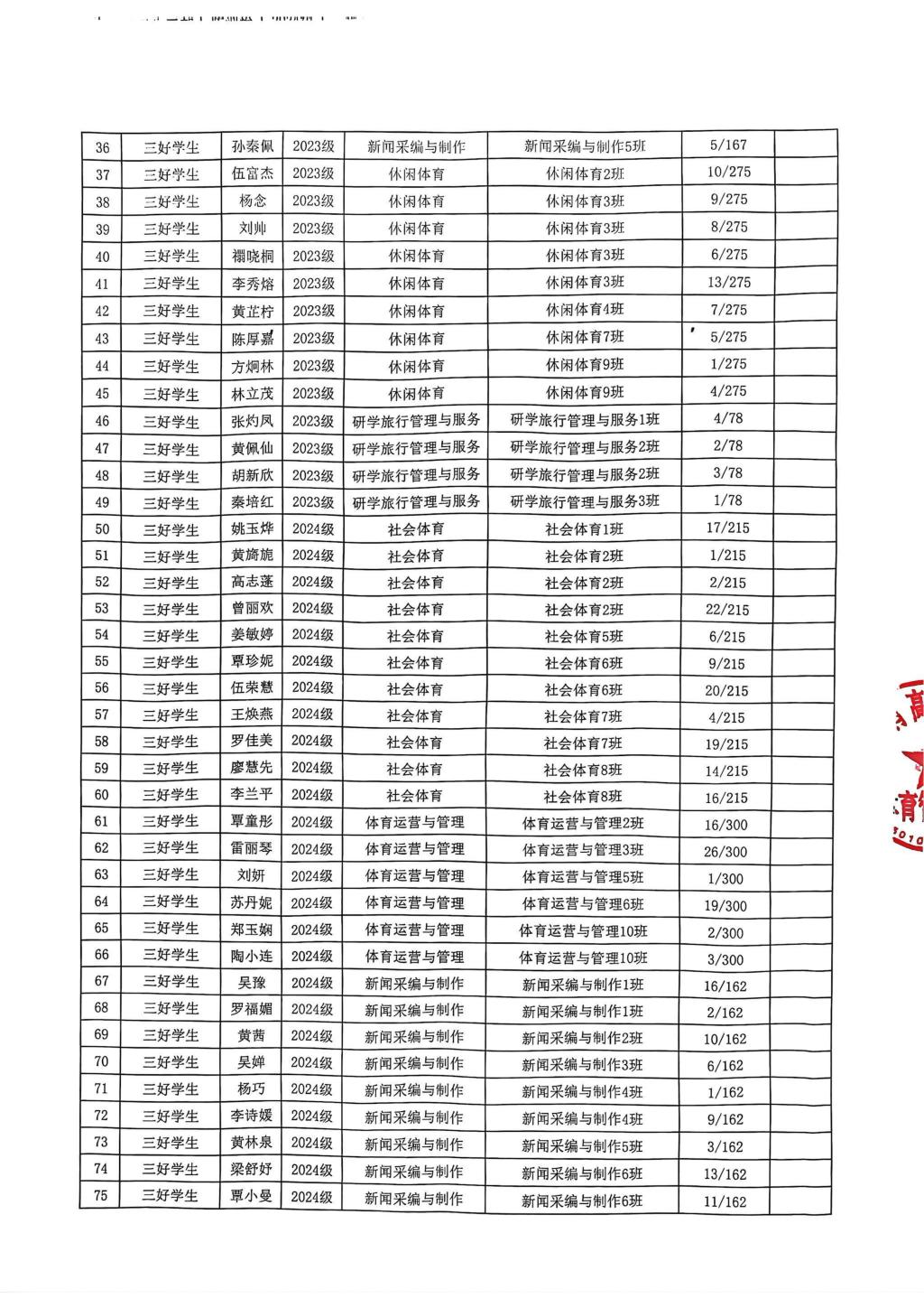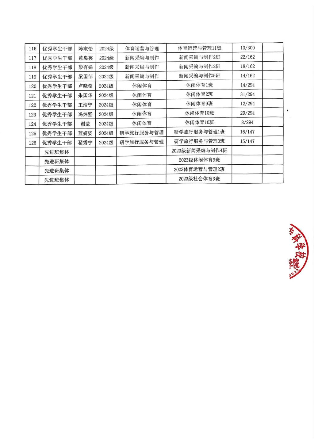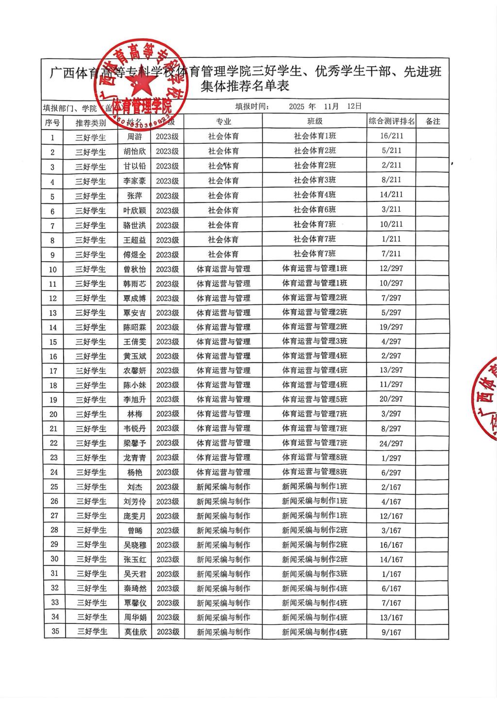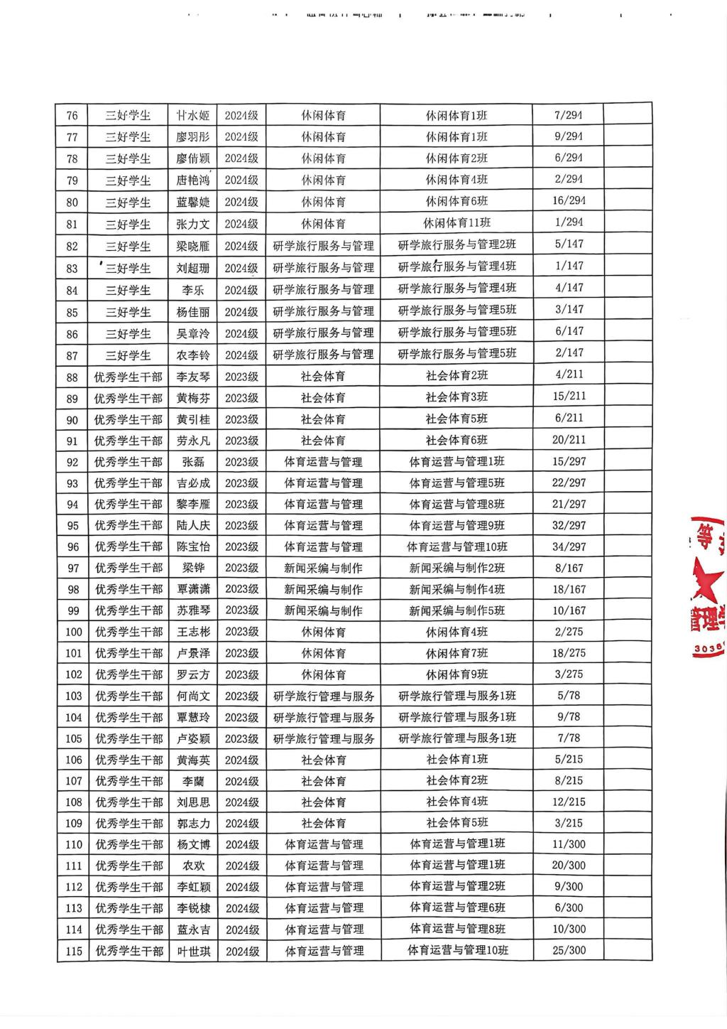 广西体育高等专科学校体育管理学院三好学生、优秀学生干部、先进班集体推荐名单表