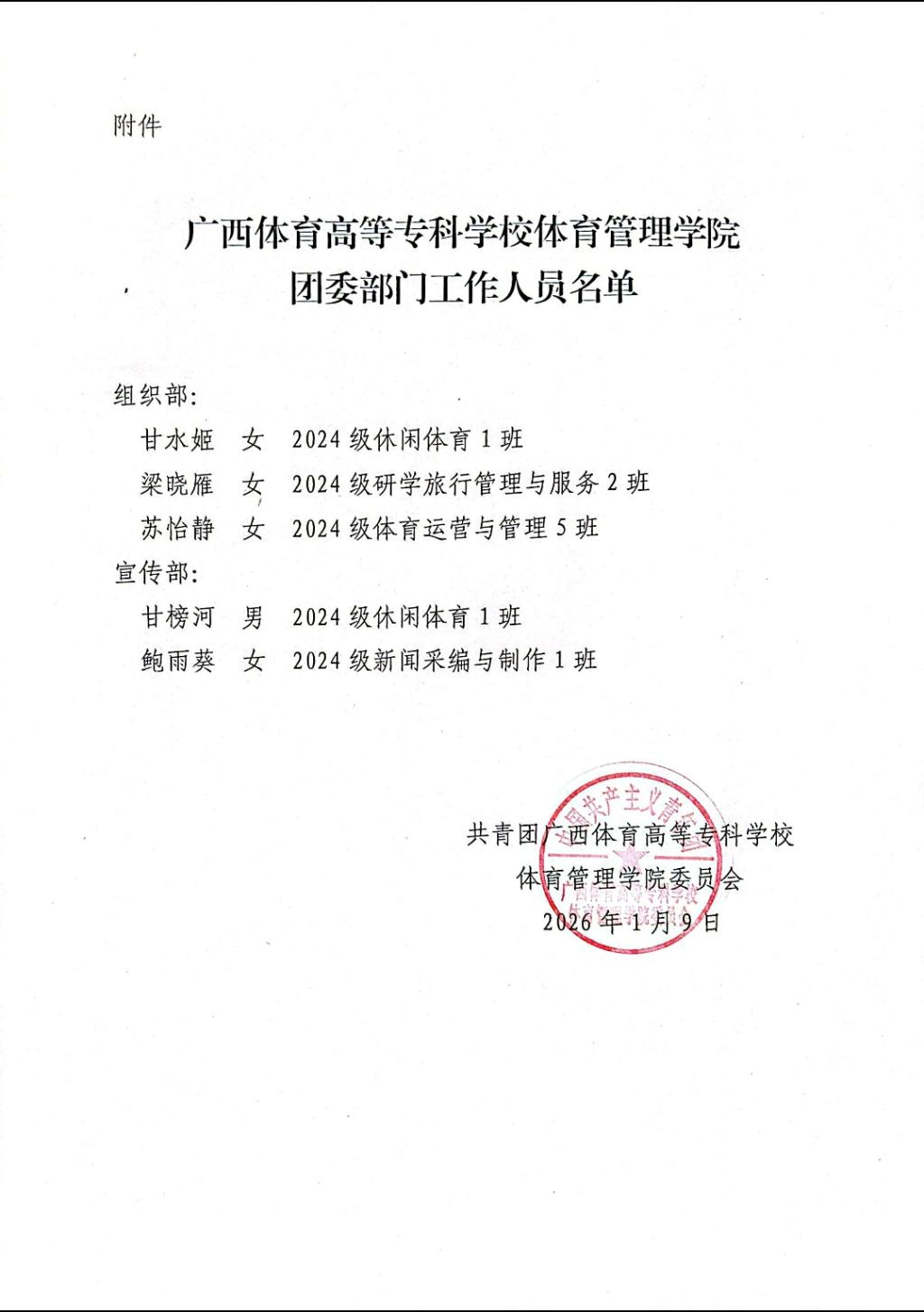 关于确定广西体育高等专科学校体育管理学院团委部门工作人员名单的公示