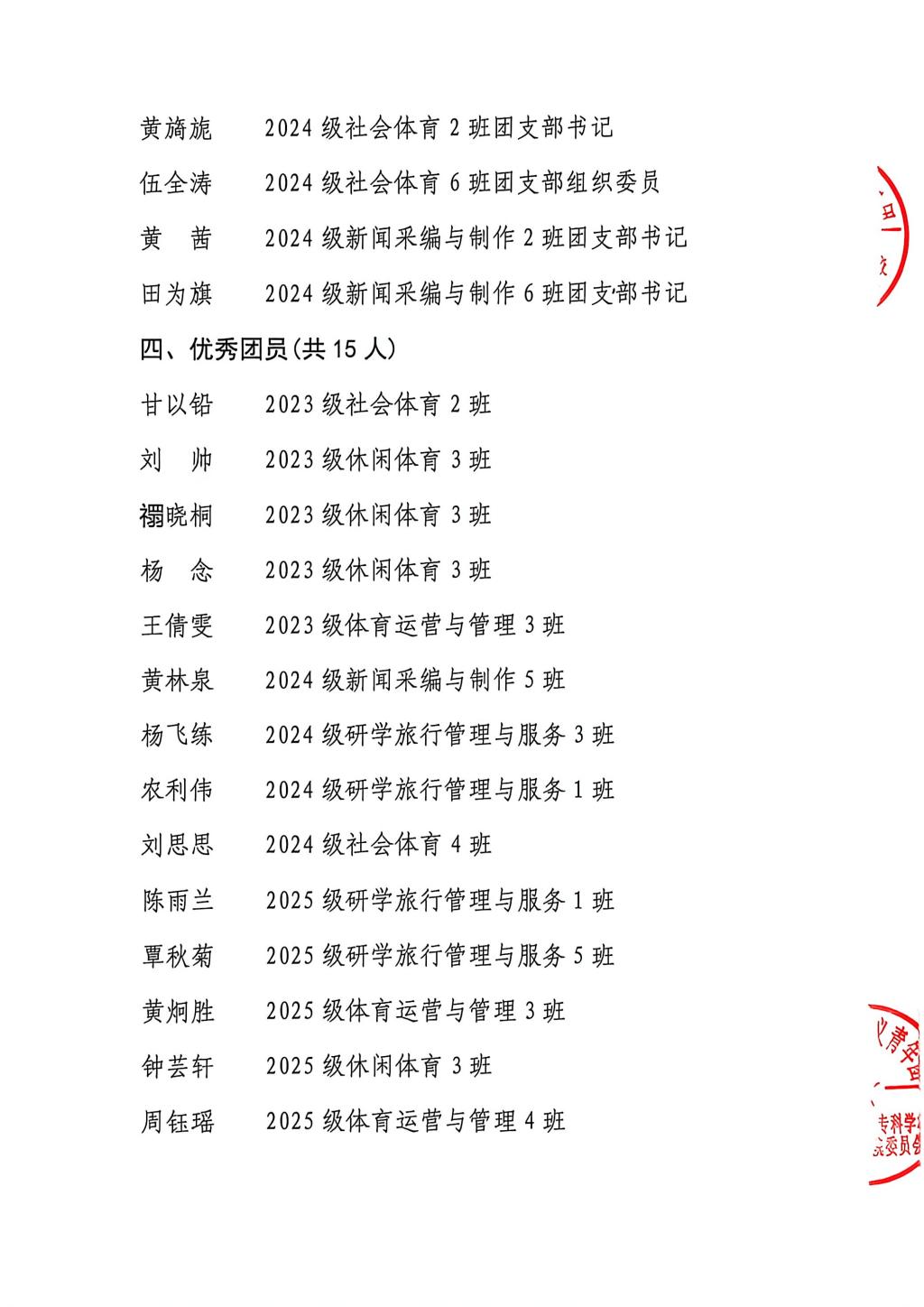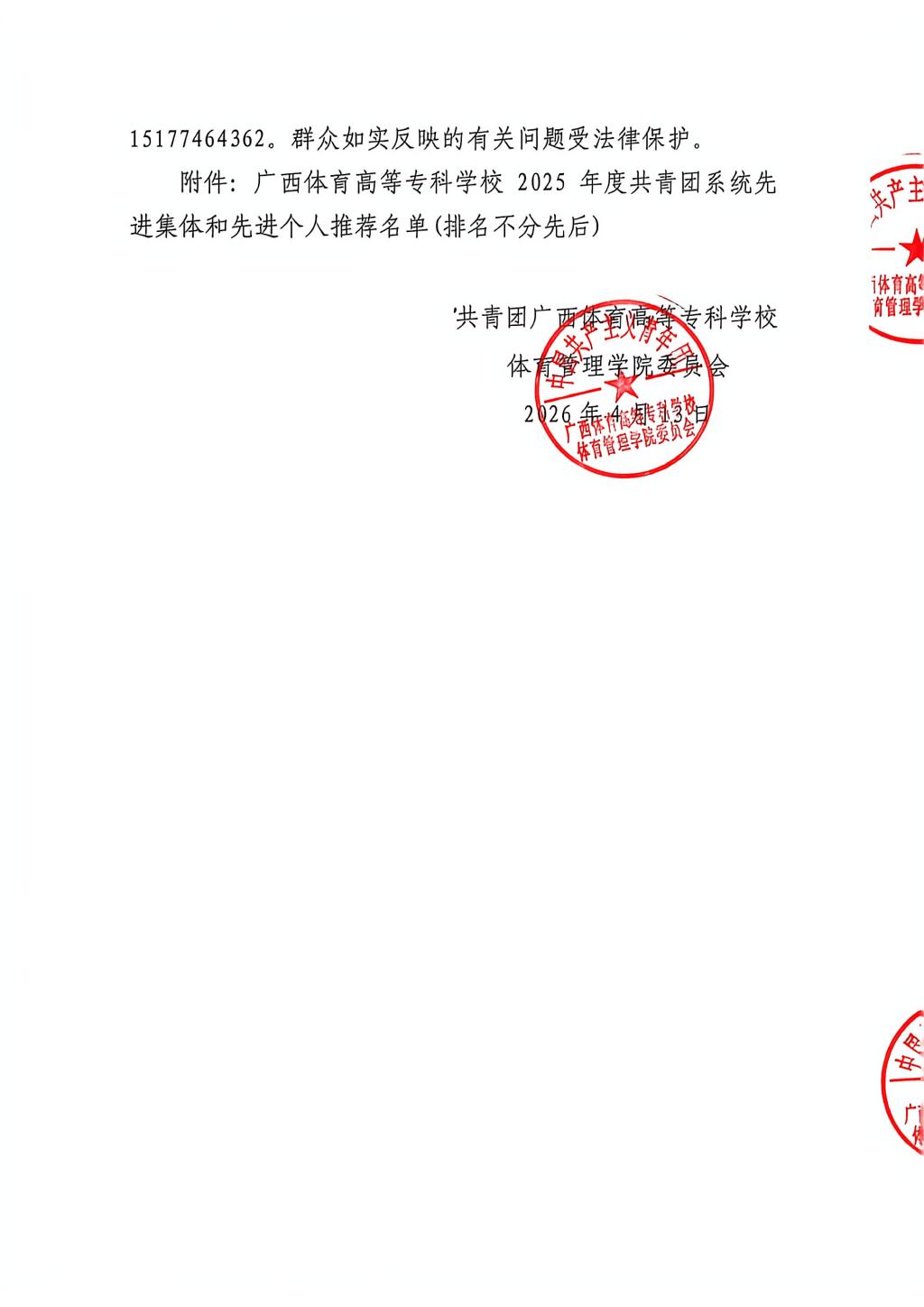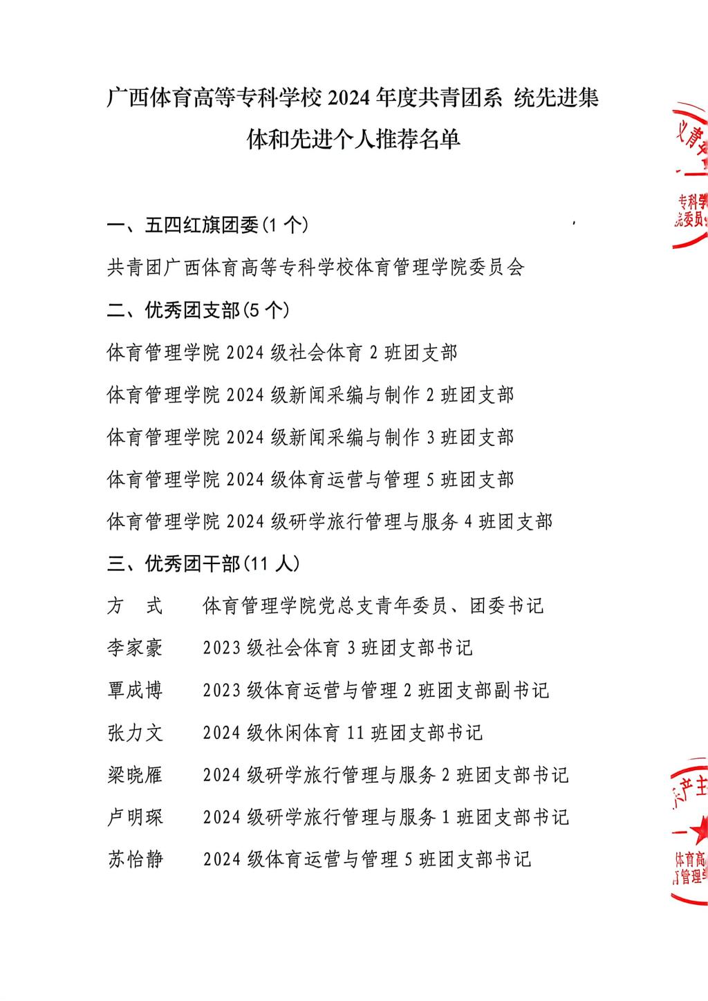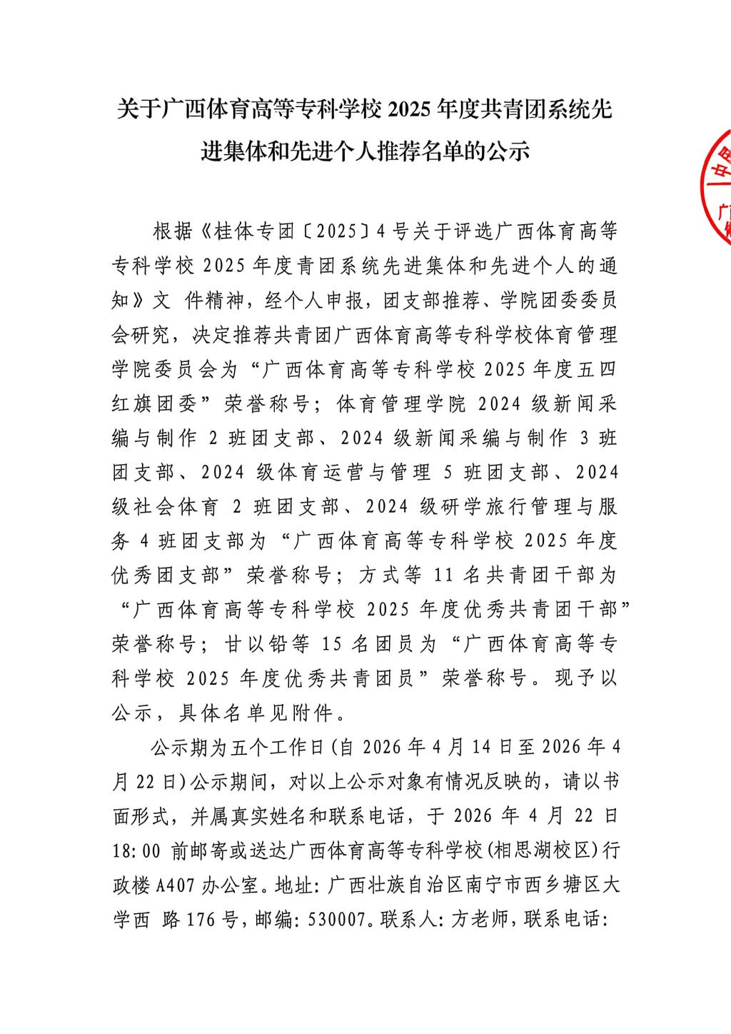 关于广西体育高等专科学校2025年度共青团系统先进集体和先进个人推荐名单的公示