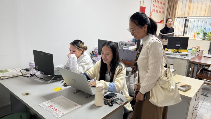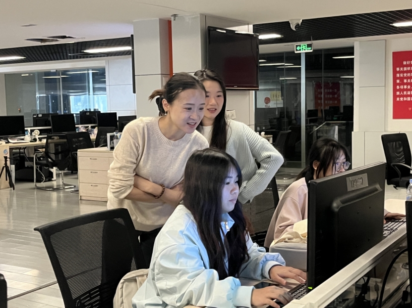 教师团队首先与融媒体中心实习指导老师刘子亮进行交流,全面了解学生实习安排、岗位适应情况及实践能力表现。随后,团队深入走访了学生所在的国际传播中心、校园大视界、教育专班组等部门,实地察看工作环境与任务内容,并与带教老师进行面对面交流,细致了解学生在活动策划、内容制作、全媒体发布等环节的实践表现。