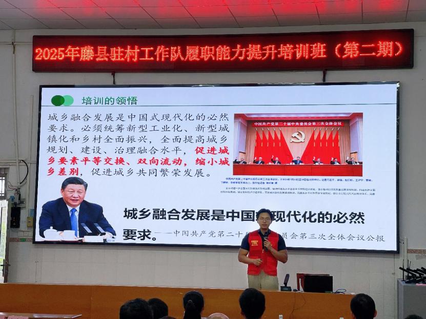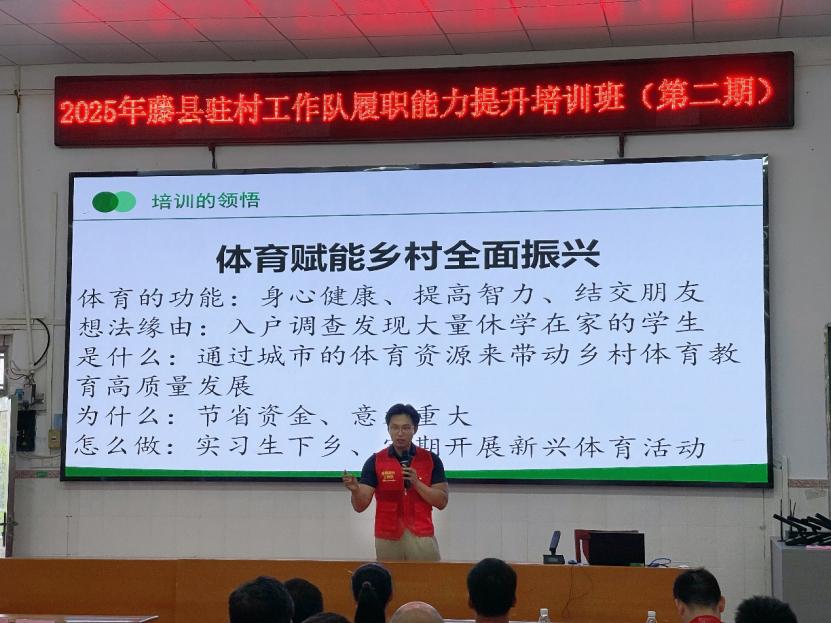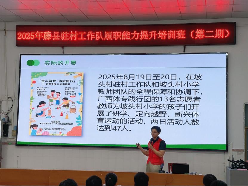 2025年9月5日,藤县驻村工作队履职能力培训班(第二期)顺利结业。本次培训以提升驻村工作实效、推动乡村振兴为核心目标,坡头村驻村工作队作为学员代表,以广西体育高等专科学校“三下乡”活动为典型案例,系统汇报了体育教育赋能乡村发展的实践路径,获得与会领导与学员的高度认可。