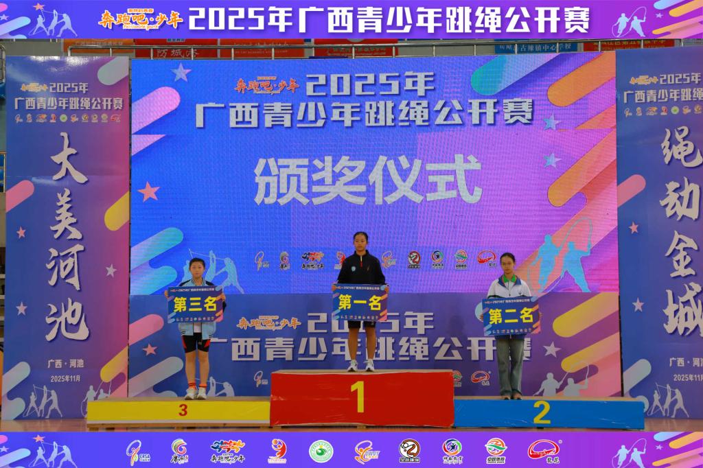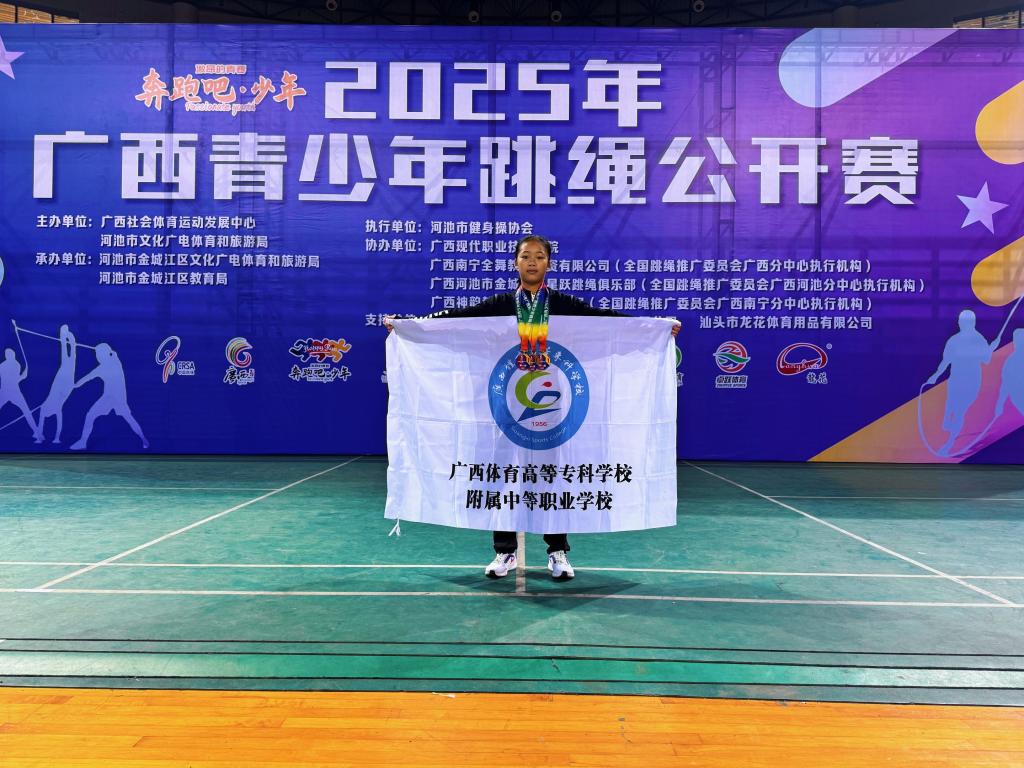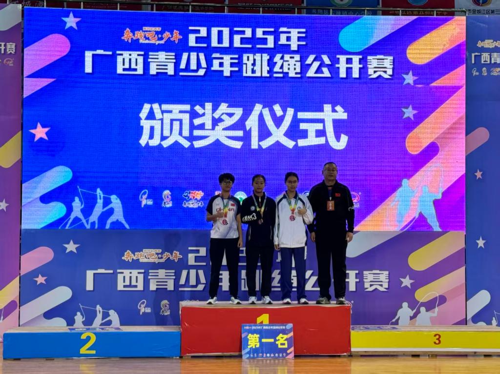 10月31日至11月2日,2025年广西青少年跳绳公开赛在河池市举行。我校庞玉凤同学在强手如林的激烈角逐中,凭借顽强的意志、出色的技艺和稳定的发挥,一举夺得国内个人花样、30秒单摇跳和3分钟单摇跳三个项目的第一名。
