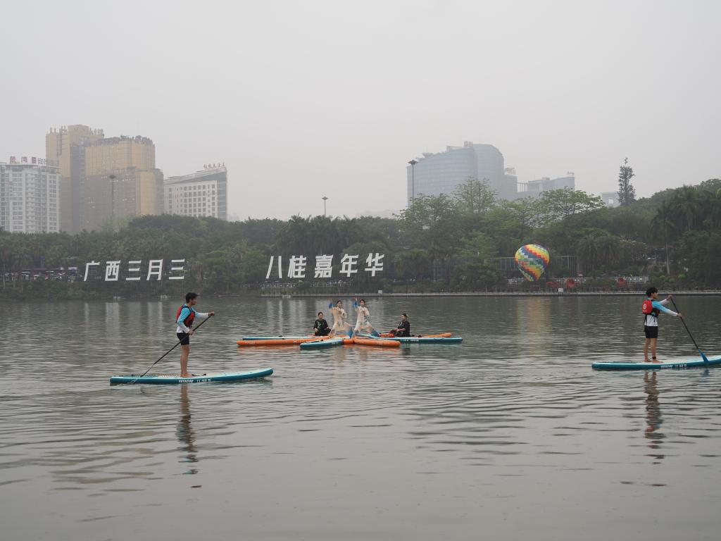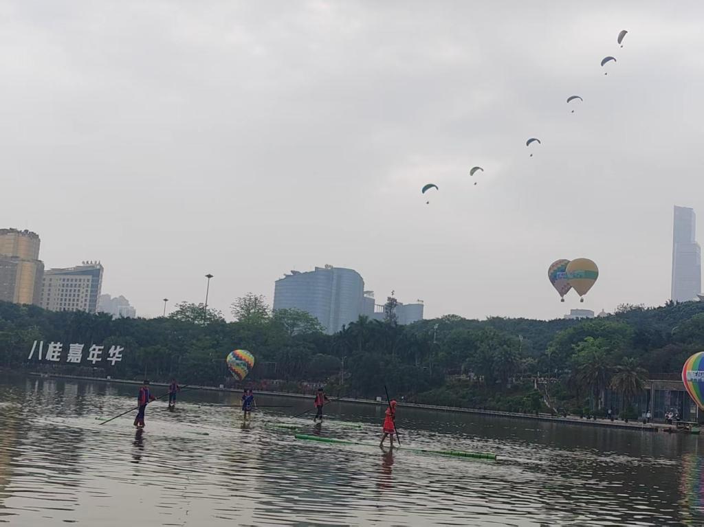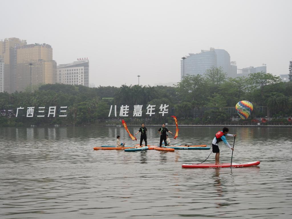 当日,民歌湖人气高涨,自治区党委书记陈刚、自治区政府主席韦韬、自治区政协主席孙大伟等领导亲临开幕式,与群众互动。各族人民尽情地观看展演、轻松地体验AI,开心地品尝美食,现场洋溢着浓浓的壮乡风情。作为主要的展演内容,我校以桨板、独竹漂、太极拳和彩带龙等项目为主线,协同动力伞和热气球等空中项目,通过水陆空三维模式展现了民族体育与现代体育的完美结合,得到广大群众的好评和喜爱。