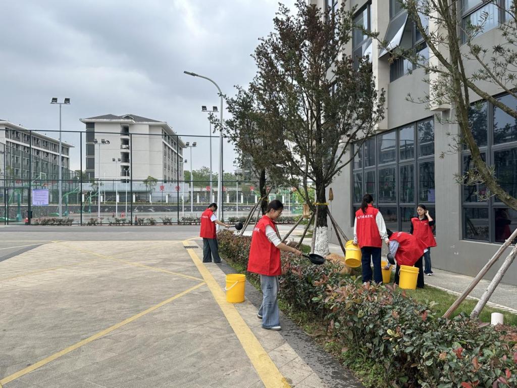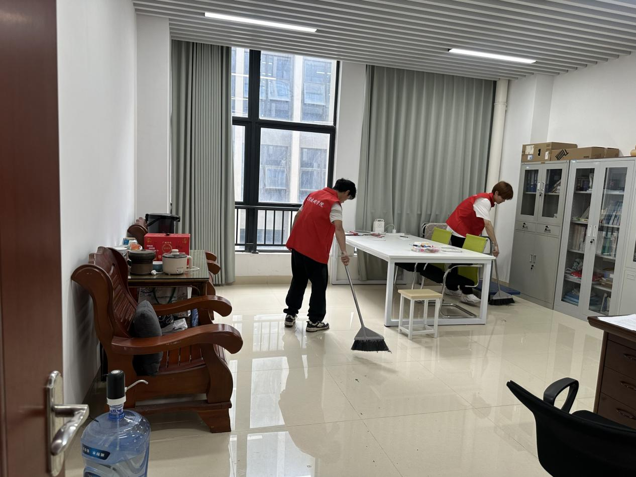 在爱绿护绿环节,同学们提着水桶穿梭林间为树木绿植浇灌补水,轻轻打理枝干、认真润泽根部,用双手呵护春日绿意,以点滴行动守护校园生态。此外,志愿者们还走进学院各办公室,擦拭桌椅、整理资料、清扫地面,为老师们打造干净整洁、舒适温馨的办公环境。