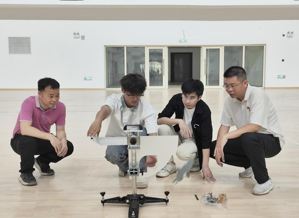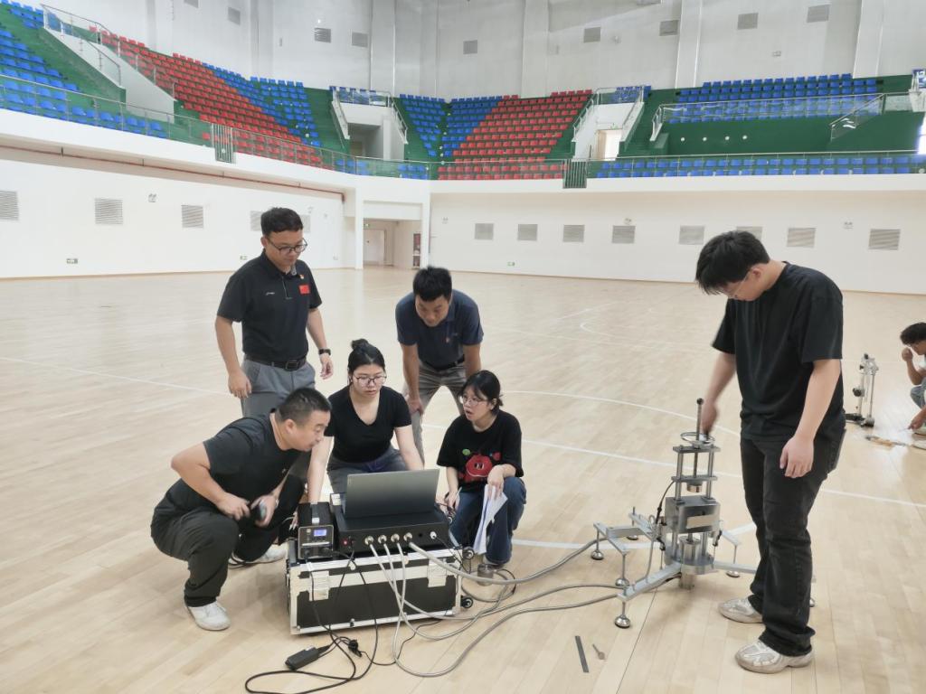活动以党建引领实践育人为主线,支部党员教师带领体育建筑方向学生,运用专业检测仪器对即将投入使用的新建篮球馆运动木地板进行标准化检测,着重检查场地的使用性能与安全指标。党员教师现场实操示范操作检测流程,讲解专业技术要点,学生认真记录并实践测量研判,将专业知识转化为服务校园的具体行动。