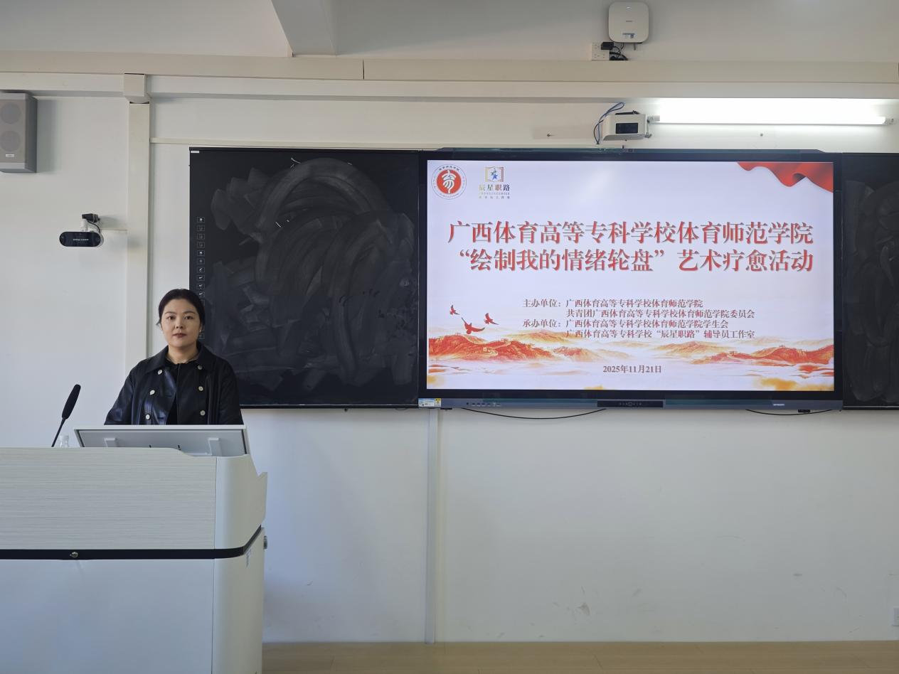 11月21日,体育师范学院在南教学楼105教室成功举办了以“绘制我的情绪轮盘”为主题的艺术心理团辅活动,活动对象为2025级心理委员。此次活动旨在通过充满创意和乐趣的艺术疗愈觉察自我情绪、处理情绪,引导学生关注自身心理健康,提升心理健康意识。