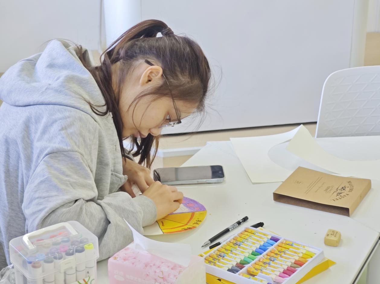 活动伊始,心理专干毕玉老师向大家介绍了情绪轮盘的概念和绘制方法,随后引导同学们闭上双眼,调整呼吸,完成情绪的内观,思考自己近段时间的情绪状态以及情绪体验,想象情绪对应的颜色和形状。这一过程帮助大家更深入地了解自己的内心世界。在同学们准备好之后,让同学们开始动手绘制自己的情绪轮盘。有的同学用鲜艳的色彩勾勒出快乐、兴奋等积极情绪,有的同学则用深沉的色调表达内心的焦虑、迷茫,通过线条的交错和形状的组合,将这些复杂情绪具象化地展现出来。在这个过程中,同学们沉浸其中,用心感受每一笔每一划所传达的情绪信息,仿佛在与自己的内心进行一场无声的对话。