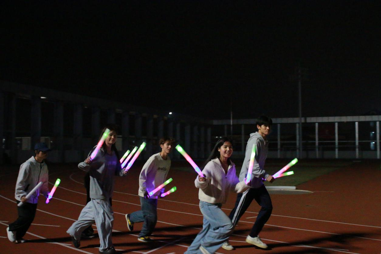 夜幕初垂,荧光点点,同学们手持彩光,在操场上轻盈奔跑,将压力与疲惫化作汗水挥洒于夜色之中。随后的冥想放松环节,灯光渐暗,乐声轻起,大家静坐一隅,在轻柔的引导中调整呼吸、舒缓身心,让心灵归于安宁。