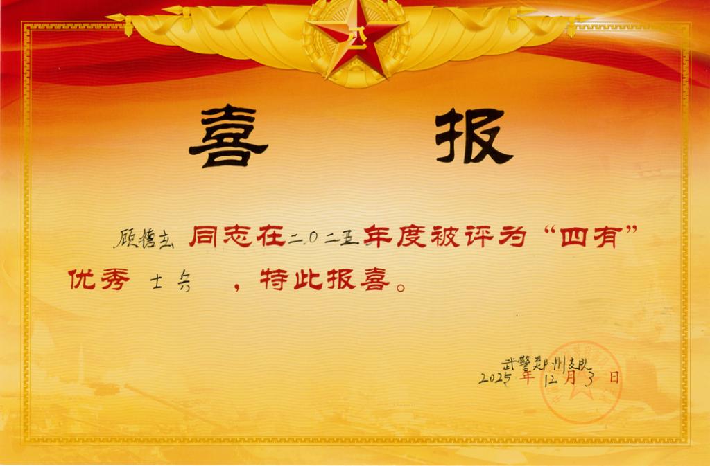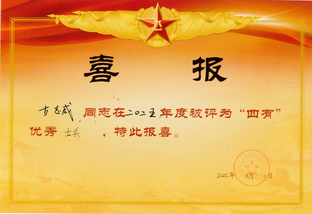 近日,军营中传来我校学子的捷报,古志威、顾德玄同学因在部队军事训练和纪律作风等方面表现突出,被部队评为2025年度“四有”优秀士兵荣誉称号。