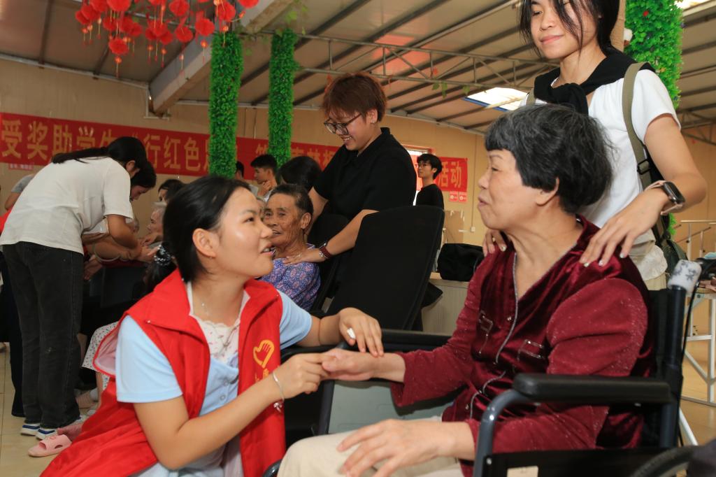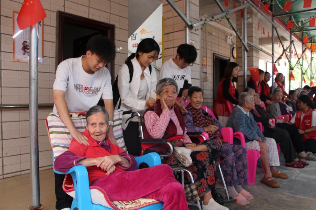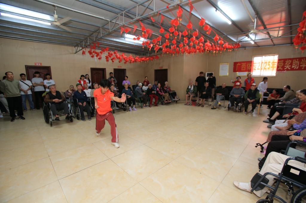 11月月8日下午,同学们分成两组,分别前往钦州市钦南区和谐养老院与钦北区宝康护理院开展志愿服务。在养老院内,学生们满怀热忱,悉心照料每一位老人:推拿按摩组的成员娴熟地为老人舒缓肩颈酸痛;洗脚、剪指甲组的成员屈膝蹲身,以亲人般的细致为老人修剪指甲、清洁双足;量血压的成员则认真记录数据,确保每位老人能够及时关注身体状况。活动尾声,同学们精心准备了歌舞与武术表演,精彩的演出逗得老人开怀大笑,现场气氛达到高潮。通过这次亲身实践,学生们不仅增强了社会责任感,更在实践中践行红色精神,将青春梦想融入日常奉献,进一步深化了研学活动的意义。
