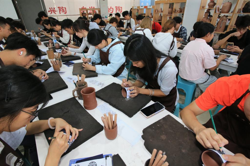 图为学生体验国家非遗“坭兴陶”雕刻工艺