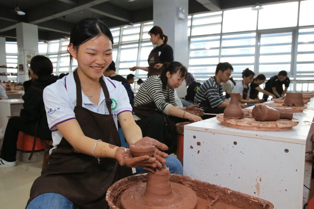 图为学生体验国家非遗“坭兴陶”制作工艺