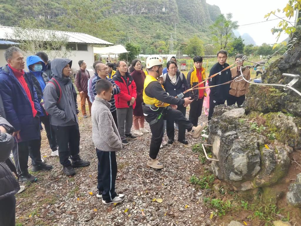 当日上午,教职工队伍首先抵达古灵攀岩小镇。作为集户外体验与休闲度假于一体的特色景区,这里专业的攀岩设施与原生态的自然环境相得益彰。在景区专业教练的指导下,教职工们系统学习了攀岩技巧、安全注意事项及专业装备的正确使用方法。从安全带穿戴、岩点选择到发力技巧,教练逐一示范讲解,耐心解答大家的疑问。随后,进行攀岩体验活动。