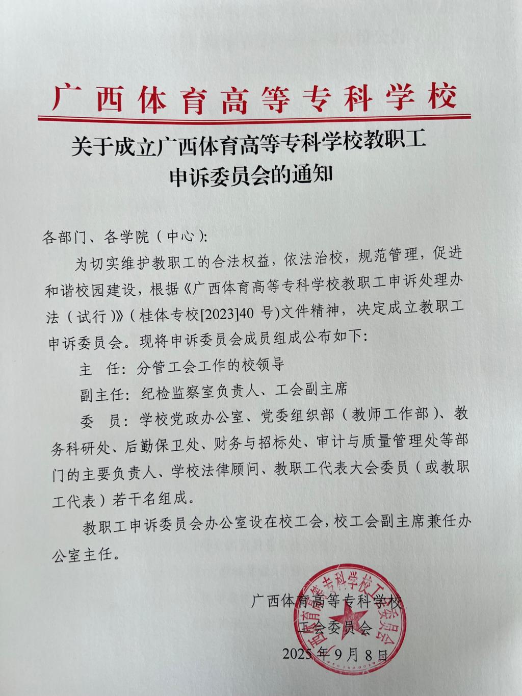 关于成立广西体育高等专科学校教职工申诉委员会的通知