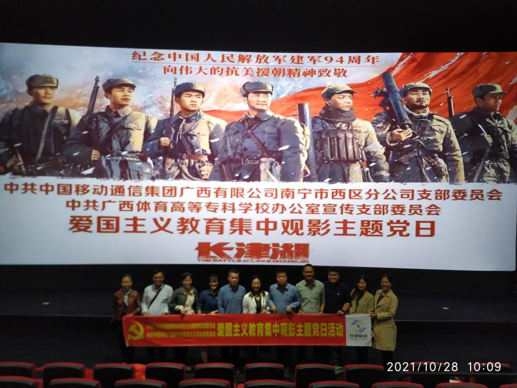 10月28日,办公室宣传党支部与中国移动通信集团广西有限公司南宁市西区分公司党支部在江宇万达影城联合开展爱国主义教育集中观影主题党日活动,观看电影《长津湖》。