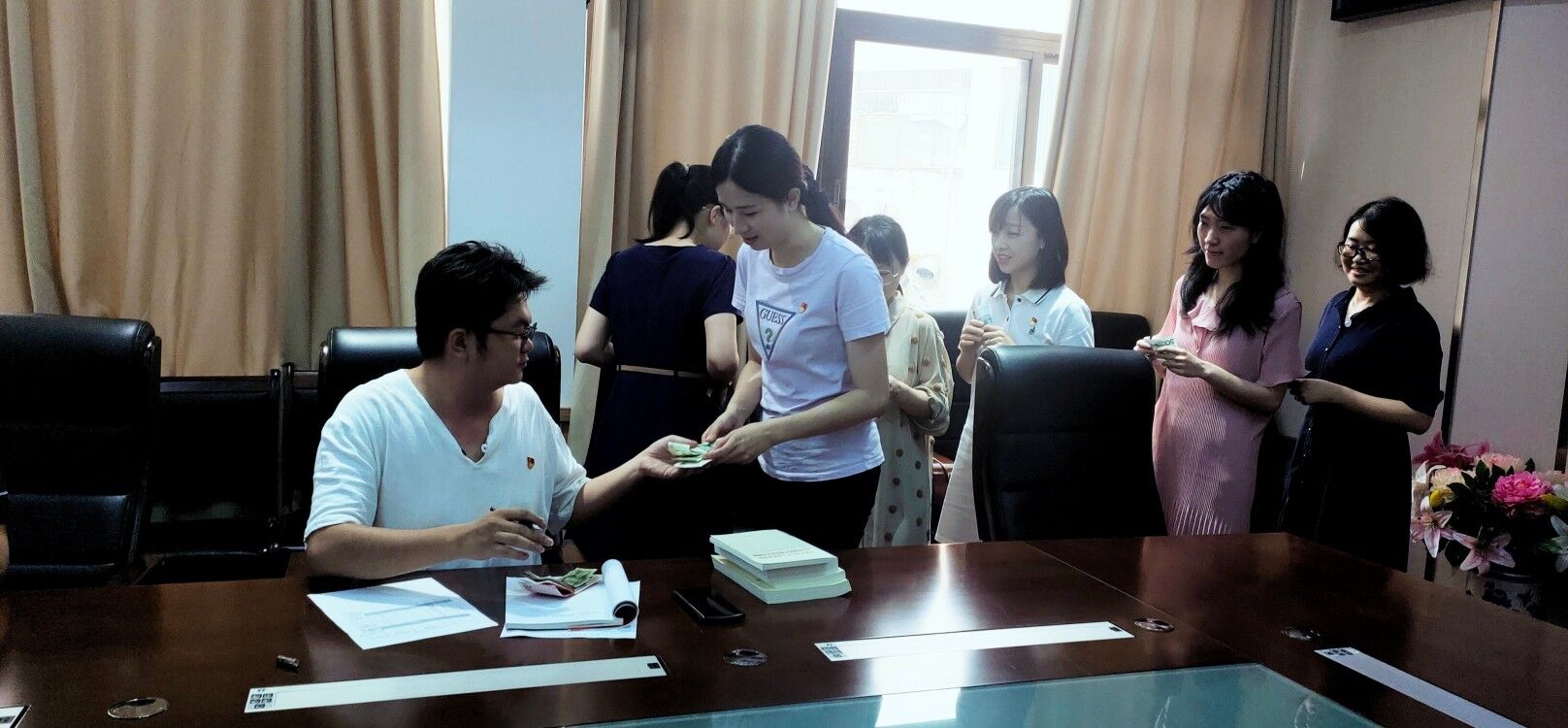 5月19日,办公室宣传党支部开展“党员集中缴纳党费”主题党日活动。活动中,支部全体党员排队依次向组织委员缴纳党费。