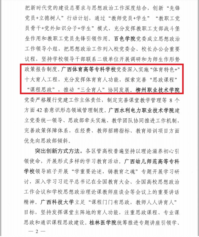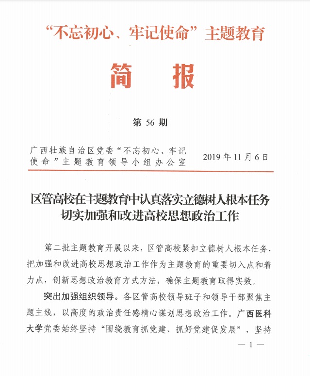 11月6日,我校实施“体育特色+”十大育人工程登上自治区“不忘初心、牢记使命”主题教育办第56期简报。