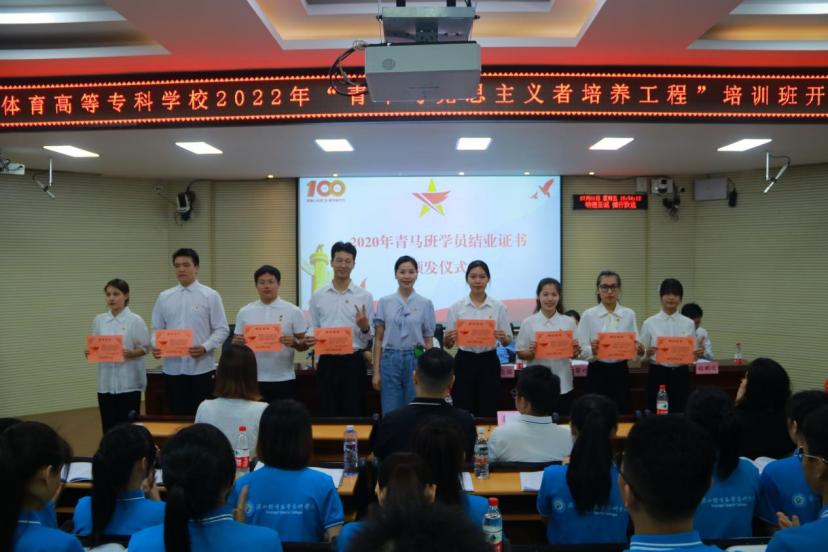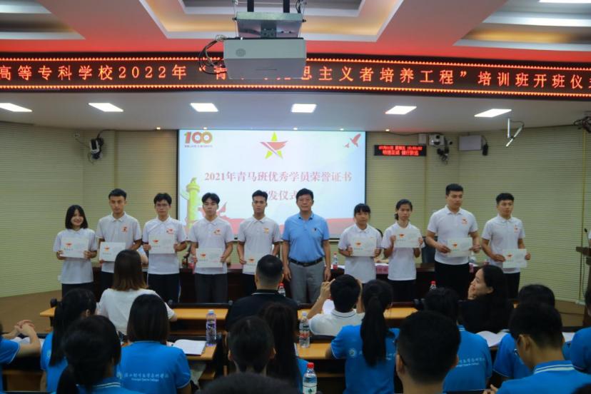 出席开班仪式的领导分别为2020年、2021年学校青马班学院颁发结业证书并合影留念。学校党委副书记李爱民为2022年青马班学员代表授旗。