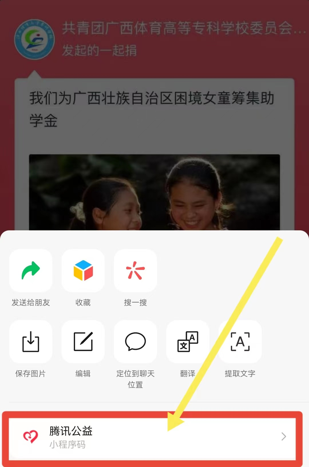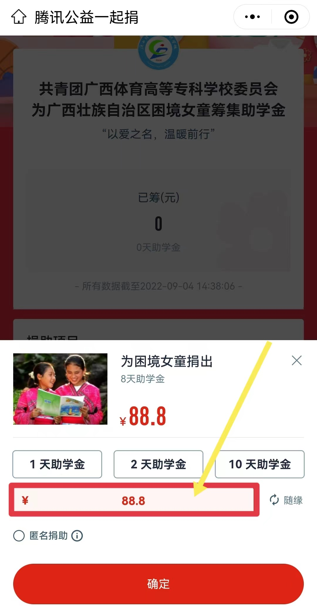 微信扫描共青团广西体育高等专科学校委员会“春蕾计划捐款”项目二维码→点击进入腾讯公益进入小程序→点击下方“捐出第一笔”→选择捐赠金额或自定义金额→点击确定→输入支付密码,即可完成捐赠。