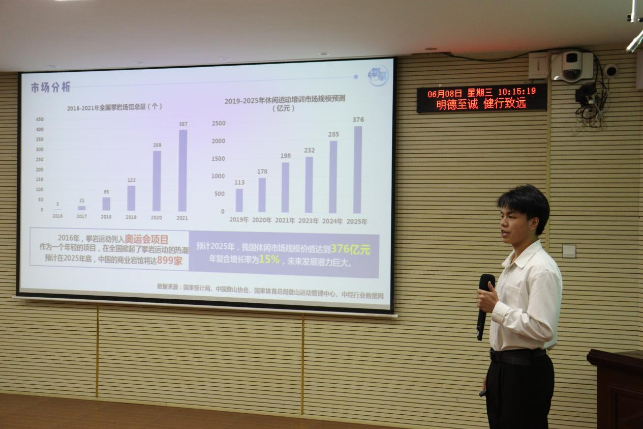 为积极营造“互联网+”创新创业竞赛的氛围,切实提高我校学生创新创业的意识和能力,校团委于6月8日在综合楼402报告厅举办第八届中国国际“互联网+”大学生创新创业大赛校内选拔赛决赛。党委副书记李爱民,学生工作处处长韦伦国,学生工作处副处长、团委书记黎智达,校团委副书记韦宛辰,运动科学与健康学院党总支副书记胡天晓,体育经济管理学院党总支副书记祁丽及各学院团委书记出席本次比赛。