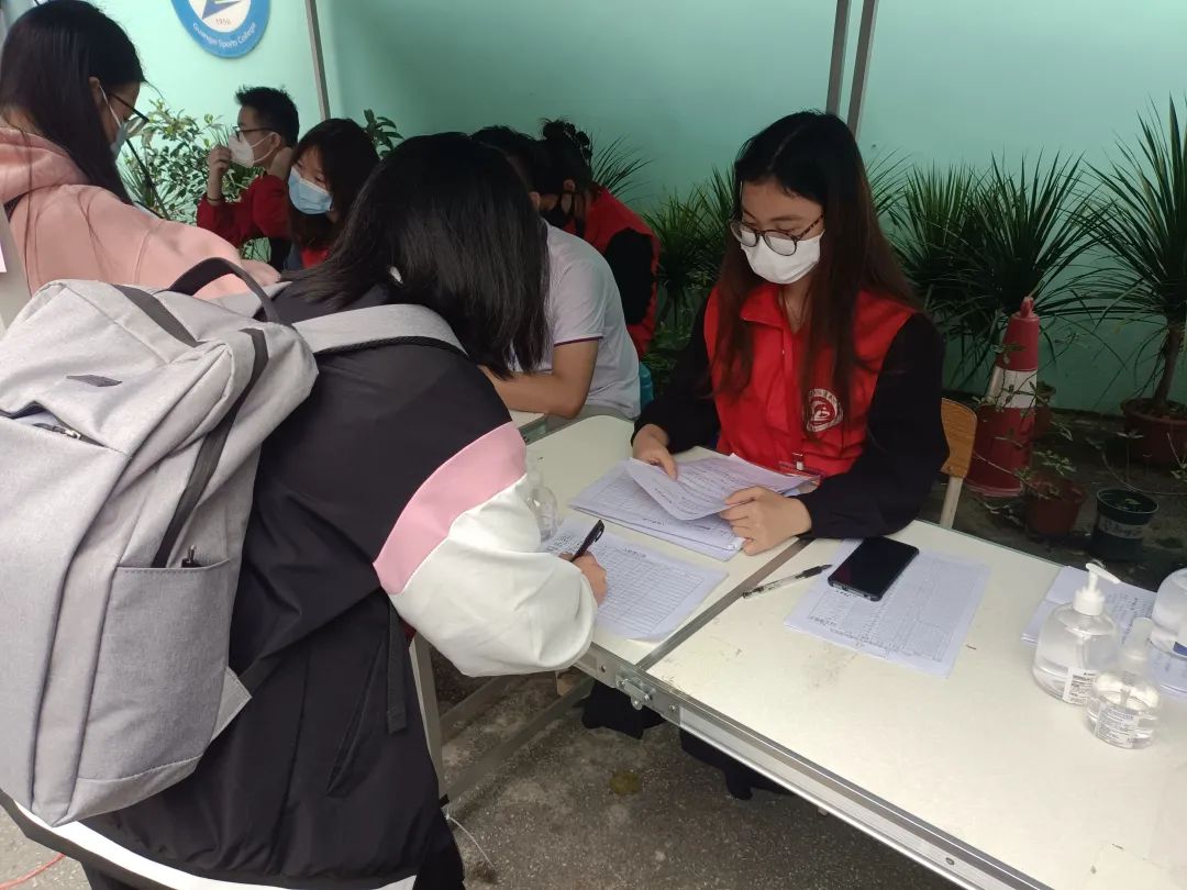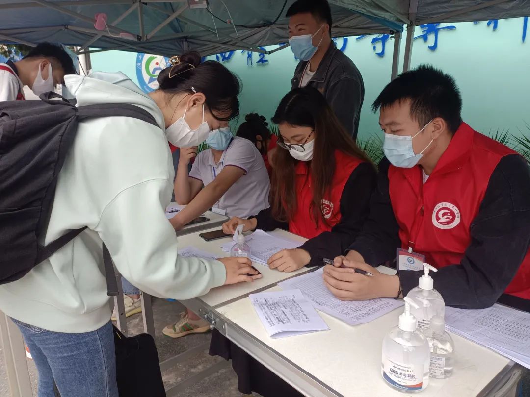 志愿者们在服务站点开展志愿服务工作,主要负责测量体温,核验健康码、行程卡,收集48小时内核酸检测报告、《返校安全承诺书》、《十四天体温健康检测表》和引导维护秩序等,切实服务学生返校各环节。