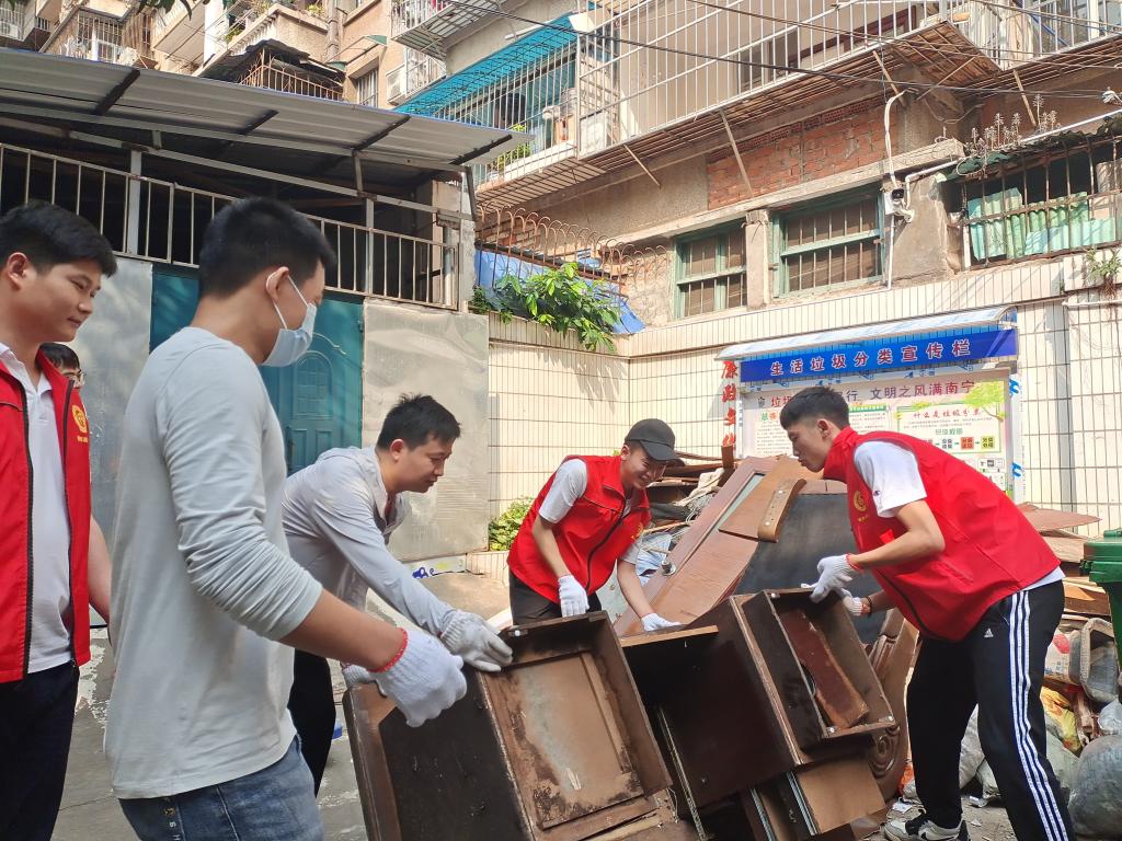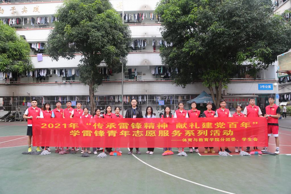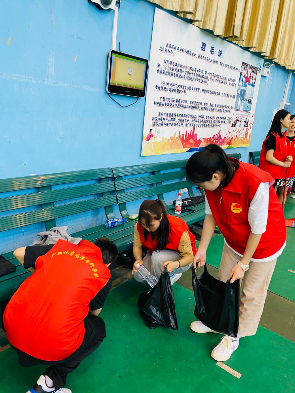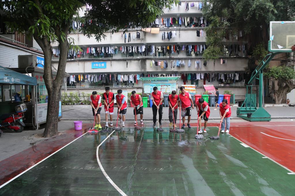 体育与教育学院青年志愿者对校内篮球场进行打扫