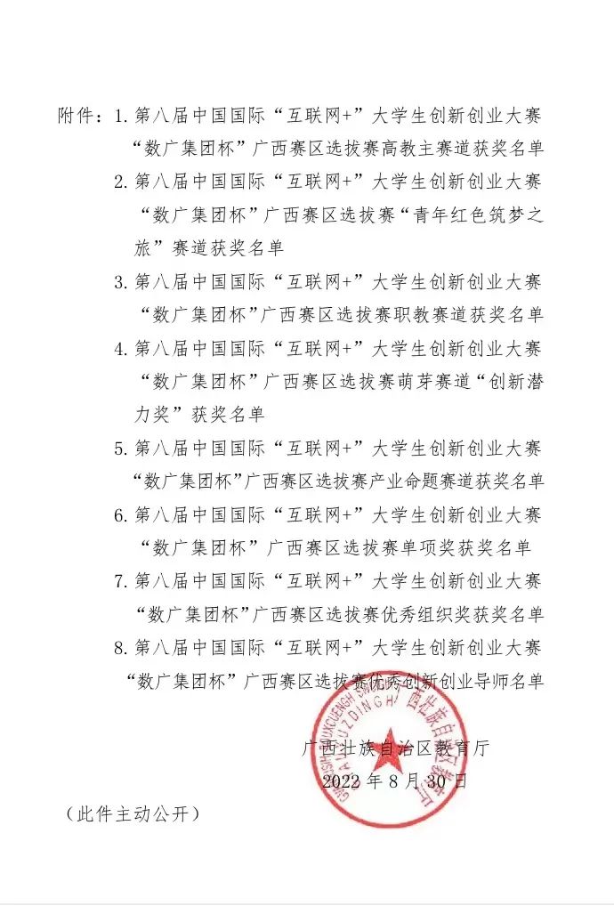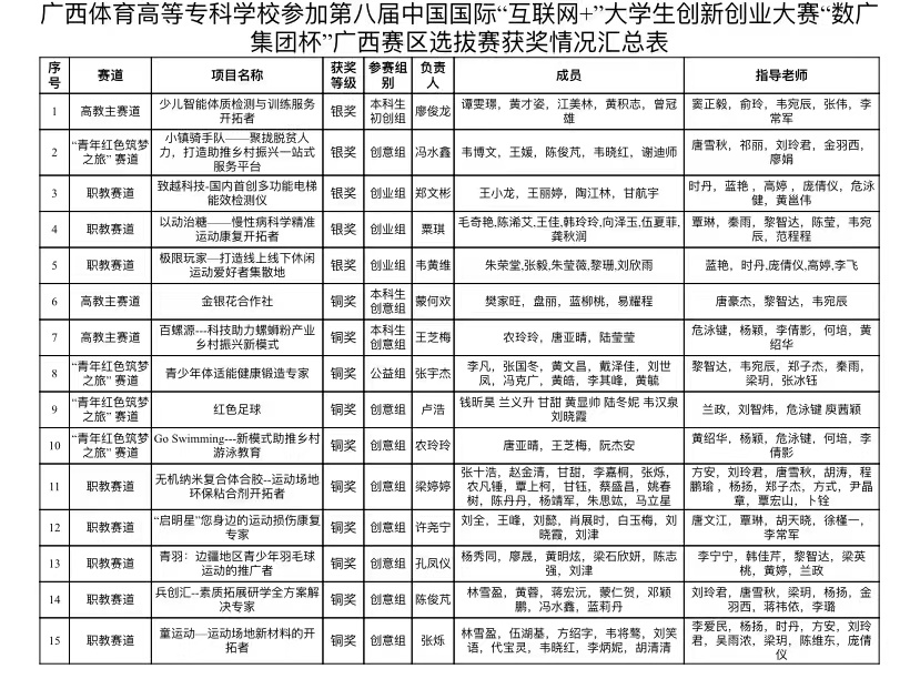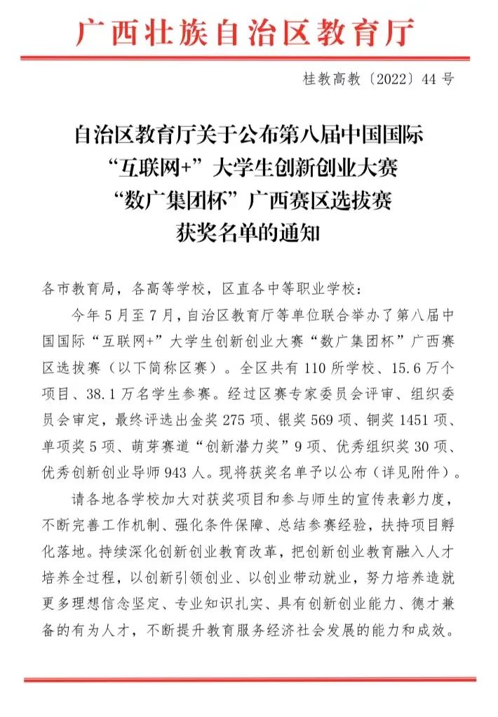 为深入贯彻落实习近平总书记关于教育的重要论述,落实立德树人的根本任务,纵深推进大众创业万众创新,今年5月至7月,自治区教育厅等单位联合举办了第八届中国国际“互联网+”大学生创新创业大赛“数广集团杯”广西赛区选拔赛,我校在此次大赛中荣获4银11铜的佳绩。