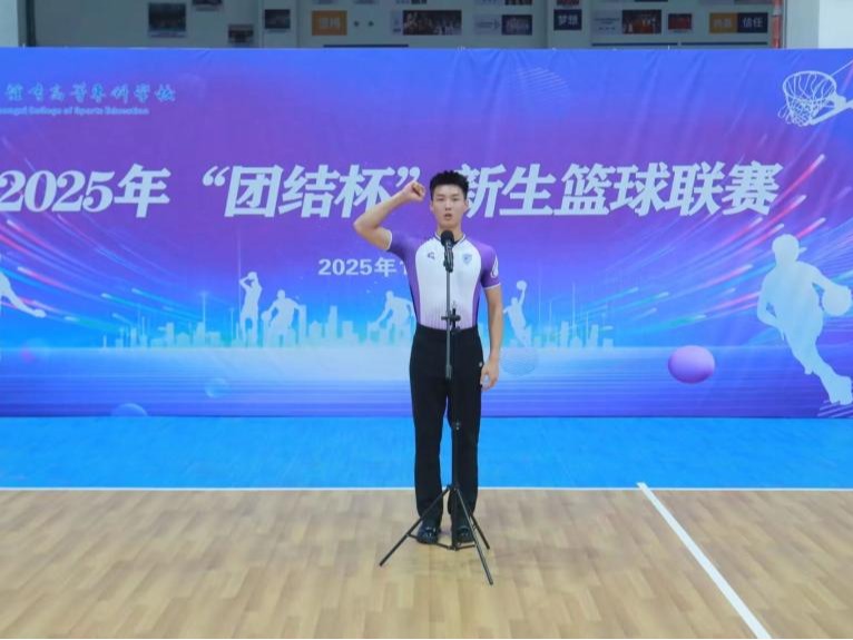 在热烈的掌声中,校团委书记何培正式宣布:“广西体育高等专科学校2025年‘团结杯’新生篮球联赛,开幕!”