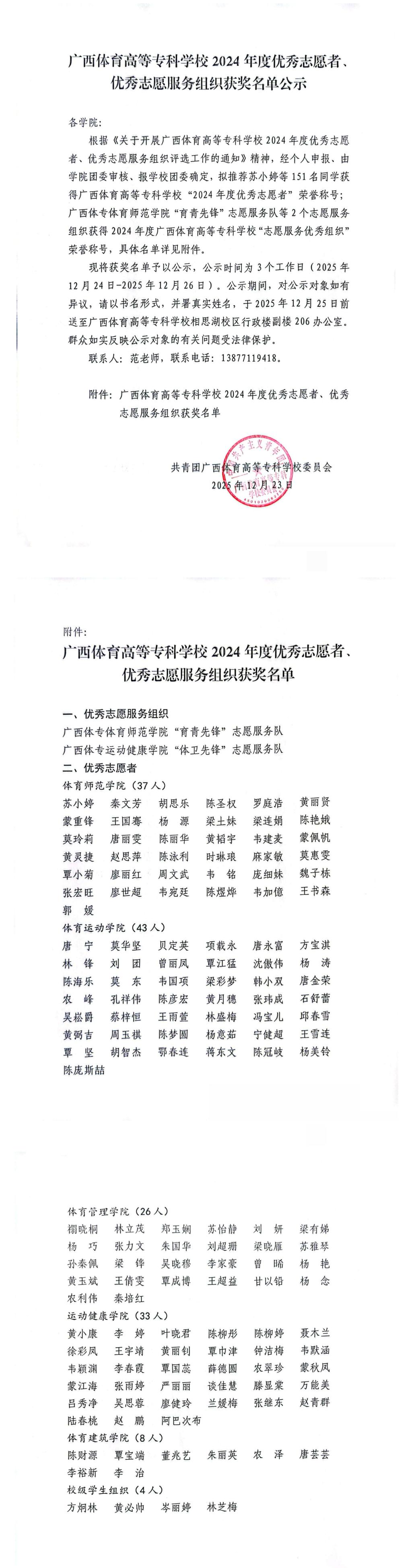 广西体育高等专科学校2024年度优秀志愿者、优秀志愿服务组织获奖名单公示